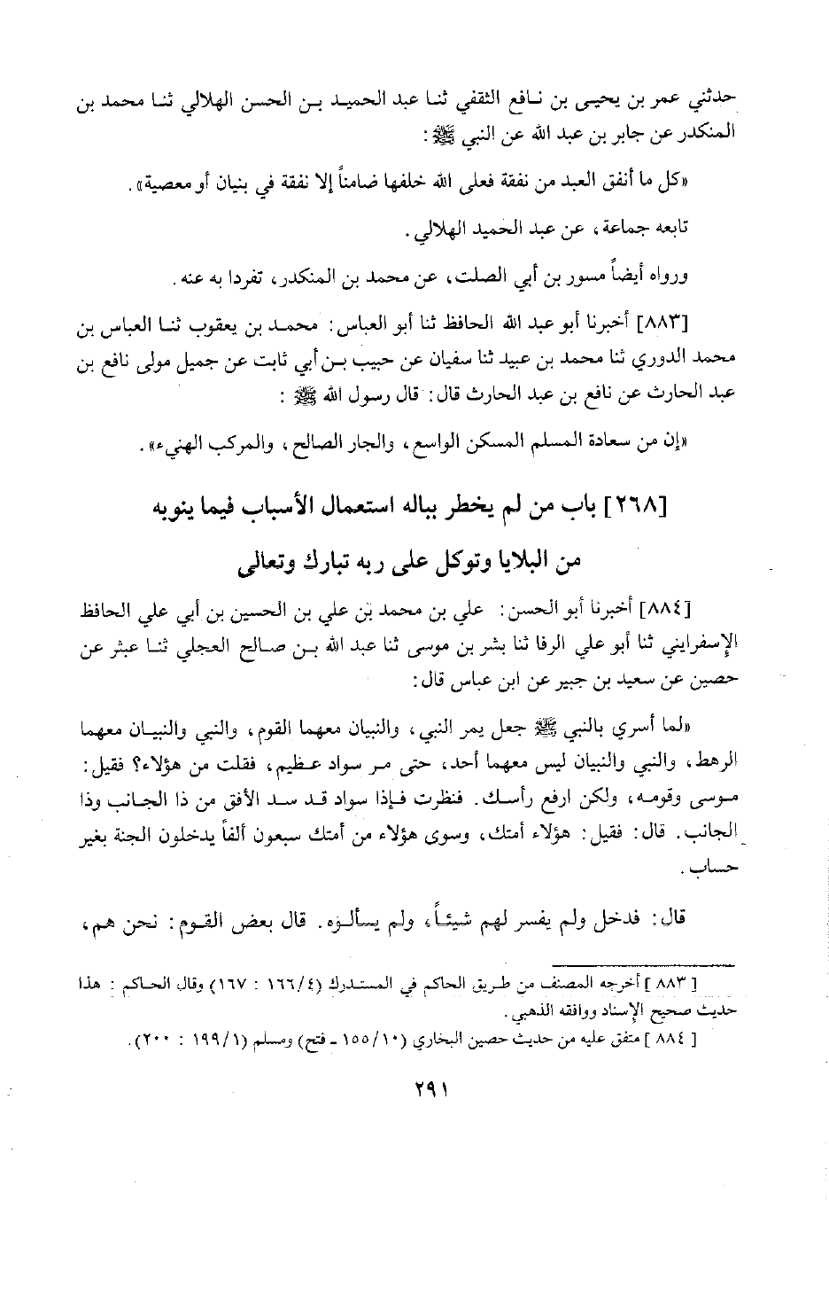712 - أَخْبَرَنَا أَبُو الْحَسَنِ عَلِيُّ بْنُ مُحَمَّدِ بْنِ عَلِيِّ بْنِ الْحُسَيْنِ بْنِ أَبِي عَلِيٍّ الْحَافِظُ الْإِسْفَرَايِينِيُّ، حَدَّثَنَا أَبُو عَلِيٍّ الرَّفَّاءُ، حَدَّثَنَا بِشْرُ بْنُ مُوسَى، حَدَّثَنَا عَبْدُ اللَّهِ بْنُ الْعِجْلِيِّ، حَدَّثَنَا عَبْثَرُ، عَنْ حُصَيْنٍ، عَنْ سَعِيدِ بْنِ جُبَيْرٍ، عَنِ ابْنِ عَبَّاسٍ قَالَ: لَمَّا أُسْرِيَ بِالنَّبِيِّ صَلَّى اللَّهُ عَلَيْهِ وَسَلَّمَ جَعَلَ يَمُرُّ النَّبِيُّ وَالنَّبِيَّانِ مَعَهُمَا الْقَوْمُ، وَالنَّبِيُّ وَالنَّبِيَّانِ مَعَهُمَا الرَّهْطُ، وَالنَّبِيُّ وَالنَّبِيَّانِ لَيْسَ مَعَهُمَا أَحَدٌ، حَتَّى مَرَّ سَوَادٌ عَظِيمٌ، فَقُلْتُ مَنْ هَؤُلَاءِ؟ فَقِيلَ: مُوسَى وَقَوْمُهُ، وَلَكِنِ ارْفَعْ رَأْسَكَ. فَنَظَرْتُ فَإِذَا سَوَادٌ قَدْ سَدَّ الْأُفُقَ مِنْ ذَا الْجَانِبِ وَذَا الْجَانِبِ. قَالَ: فَقَالَ: هَؤُلَاءِ أُمَّتُكَ، وَسِوَى هَؤُلَاءِ مِنْ أُمَّتِكَ سَبْعُونَ أَلْفًا يَدْخُلُونَ الْجَنَّةَ بِغَيْرِ حِسَابٍ. قَالَ: فَدَخَلَ وَلَمْ يُفَسِّرْ لَهُمْ شَيْئًا، وَلَمْ يَسْأَلُوهُ. قَالَ بَعْضُ الْقَوْمِ: نَحْنُ هُمْ، -[292]- وَقَالَ بَعْضُهُمْ: بَلْ هُمْ أَبْنَاؤُكَ الَّذِينَ ولِدُوا فِي الْإِسْلَامِ. فَخَرَجَ رَسُولُ اللَّهِ صَلَّى اللَّهُ عَلَيْهِ وَسَلَّمَ، فَقَالَ: §«هُمُ الَّذِينَ لَا يَكْتَوُونَ وَلَا يَسْتَرْقُونَ وَلَا يَتَطَيَّرُونَ وَعَلَى رَبِّهِمْ يَتَوَكَّلُونَ»