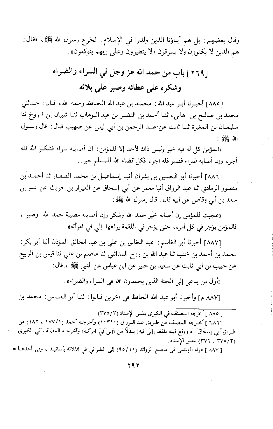 713 - أَخْبَرَنَا أَبُو عَبْدِ اللَّهِ مُحَمَّدُ بْنُ عَبْدِ اللَّهِ الْحَافِظُ رَحِمَهُ اللَّهُ قَالَ: حَدَّثَنِي مُحَمَّدُ بْنُ صَالِحِ بْنِ هَانِئٍ، حَدَّثَنَا أَحْمَدُ بْنُ النَّضْرِ بْنِ عَبْدِ الْوَهَّابِ، حَدَّثَنَا شَيْبَانُ بْنُ فَرُّوخَ، حَدَّثَنَا سُلَيْمَانُ بْنُ الْمُغِيرَةِ، حَدَّثَنَا ثَابِتٌ، عَنْ عَبْدِ الرَّحْمَنِ بْنِ أَبِي لَيْلَى، عَنْ صُهَيْبٍ قَالَ: قَالَ رَسُولُ اللَّهِ صَلَّى اللَّهُ عَلَيْهِ وَسَلَّمَ: §" الْمُؤْمِنُ كُلُّ مَا فِيهِ خَيْرٌ وَلَيْسَ ذَلِكَ لِأَحَدٍ إِلَّا لِلْمُؤْمِنِ: إِنْ أَصَابَهُ سَرَّاءُ فَشَكَرَ اللَّهَ فَلَهُ أَجْرٌ، وَإِنْ أَصَابَهُ ضَرَّاءُ فَصَبَرَ فَلَهُ أَجْرٌ، فَكُلُّ قَضَاءِ اللَّهِ لِلْمُسْلِمِ خَيْرٌ "