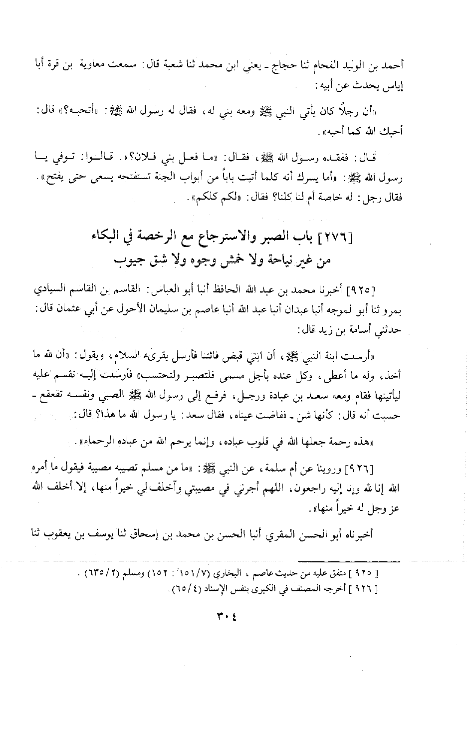 752 - أَخْبَرَنَا مُحَمَّدُ بْنُ عَبْدِ اللَّهِ الْحَافِظُ، أَنْبَأَنَا أَبُو الْعَبَّاسِ الْقَاسِمُ بْنُ الْقَاسِمِ السِّيَادِيُّ بِمَرْوَ، حَدَّثَنَا أَبُو الْمُوَجِّهِ، أَنْبَأَنَا عَبْدَانُ، أَنْبَأَنَا عَبْدُ اللَّهِ، أَنْبَأَنَا عَاصِمُ بْنُ سُلَيْمَانَ الْأَحْوَلُ، عَنْ أَبِي عُثْمَانَ قَالَ: حَدَّثَنِي أُسَامَةُ بْنُ زَيْدٍ قَالَ: أَرْسَلَتِ ابْنَةٌ لِلنَّبِيِّ صَلَّى اللَّهُ عَلَيْهِ وَسَلَّمَ أَنَّ ابْنِيَ قُبِضَ. فَأَتَانَا فَأَرْسَلَ يُقْرِئُ السَّلَامَ، وَيَقُولُ: «إِنَّ §لِلَّهَ مَا أَخَذَ، وَلَهُ مَا أَعْطَى، وَكُلٌّ عِنْدَهُ بِأَجَلٍ مُسَمًّى فَلْتَصْبِرْ وَلْتَحْتَسِبْ» فَأَرْسَلَتْ إِلَيْهِ تُقْسِمُ عَلَيْهِ لَيَأْتِيَنَّهَا فَقَامَ وَمَعَهُ سَعْدُ بْنُ عُبَادَةَ وَرَجُلٌ، فَرَفَعَ إِلَى رَسُولِ اللَّهِ صَلَّى اللَّهُ عَلَيْهِ وَسَلَّمَ الصَّبِيَّ وَنَفْسُهُ تَقَعْقَعُ حَسِبْتُ أَنَّهُ قَالَ: كَأَنَّهَا شَنٌّ فَفَاضَتْ عَيْنَاهُ، فَقَالَ سَعْدٌ: يَا رَسُولَ اللَّهِ مَا هَذَا؟ قَالَ: «هَذِهِ رَحْمَةٌ جَعَلَهَا اللَّهُ فِي قُلُوبِ عِبَادِهِ، وَإِنَّمَا يَرْحَمُ اللَّهُ مِنْ عِبَادِهِ الرُّحَمَاءَ»