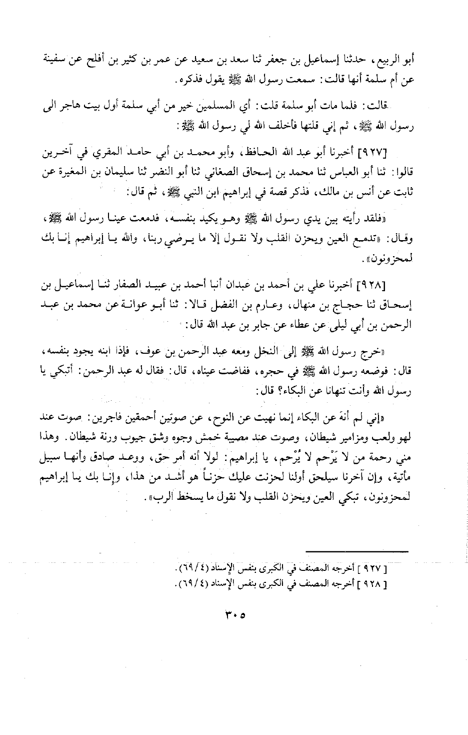 755 - أَخْبَرَنَا عَلِيُّ بْنُ أَحْمَدَ بْنِ عَبْدَانَ، أَنْبَأَنَا أَحْمَدُ بْنُ عُبَيْدٍ الصَّفَّارُ، حَدَّثَنَا إِسْمَاعِيلُ بْنُ إِسْحَاقَ، حَدَّثَنَا حَجَّاجُ بْنُ مِنْهَالٍ، وَعَارِمُ بْنُ الْفَضْلِ قَالَا: حَدَّثَنَا أَبُو عَوَانَةَ، عَنْ مُحَمَّدِ بْنِ عَبْدِ الرَّحْمَنِ بْنِ أَبِي لَيْلَى، عَنْ عَطَاءٍ، عَنْ جَابِرِ بْنِ عَبْدِ اللَّهِ قَالَ: خَرَجَ رَسُولُ اللَّهِ صَلَّى اللَّهُ عَلَيْهِ وَسَلَّمَ إِلَى النَّخْلِ وَمَعَهُ عَبْدُ الرَّحْمَنِ بْنُ عَوْفٍ، فَإِذَا ابْنُهُ يَجُودُ بِنَفْسِهِ قَالَ: فَوَضَعَهُ رَسُولُ اللَّهِ صَلَّى اللَّهُ عَلَيْهِ وَسَلَّمَ فِي حِجْرِهِ، فَفَاضَتْ عَيْنَاهُ قَالَ: فَقَالَ لَهُ عَبْدُ الرَّحْمَنِ: أَتَبْكِي يَا رَسُولَ اللَّهِ وَأَنْتَ تَنْهَانَا عَنِ الْبُكَاءِ؟ قَالَ: " إِنِّي §لَمْ أَنْهَ عَنِ الْبُكَاءِ إِنَّمَا نَهَيْتُ عَنِ النَّوْحِ، عَنْ صَوْتَيْنِ أَحْمَقَيْنِ فَاجِرَيْنِ: صَوْتٍ عِنْدَ لَهْوٍ وَلَعِبٍ وَمَزَامِيرِ شَيْطَانٍ، وَصَوْتٍ عِنْدَ مُصِيبَةٍ خَمْشِ وُجُوهٍ وَشَقِّ جُيُوبٍ وَرَنَّةِ شَيْطَانٍ. وَهَذَا مِنِّي رَحْمَةُ مَنْ لَا يَرْحَمُ، يَا إِبْرَاهِيمُ، لَوْلَا أَنَّهُ أَمْرٌ حَقٌّ، وَوَعْدٌ صَادِقٌ وَأَنَّهَا سَبِيلٌ مَأْتِيَّةٌ، وَأَنَّ آخِرَنَا سَيَلْحَقُ أَوَّلَنَا لَحَزِنْتُ عَلَيْكَ حُزْنًا هُوَ أَشَدُّ مِنْ هَذَا، وَإِنَّا بِكَ يَا إِبْرَاهِيمُ لَمَحْزُونُونَ، تَبْكِي الْعَيْنُ وَيَحْزَنُ الْقَلْبُ وَلَا نَقُولُ مَا يُسْخِطُ الرَّبَّ ". -[306]- وَرُوِّينَا فِي الْحَدِيثِ الصَّحِيحِ، عَنْ عَبْدِ اللَّهِ بْنِ عُمَرَ فِي قِصَّةِ عِيَادَةِ النَّبِيِّ صَلَّى اللَّهُ عَلَيْهِ وَسَلَّمَ سَعْدَ بْنَ عُبَادَةَ وَبُكَائِهِ، فَقَالَ النَّبِيُّ صَلَّى اللَّهُ عَلَيْهِ وَسَلَّمَ: «إِنَّ اللَّهَ لَا يُعَذِّبُ بِدَمْعِ الْعَيْنِ وَلَا بِحُزْنِ الْقَلْبِ، وَيُعَذِّبُ بِهَذَا - وَأَشَارَ إِلَى لِسَانِهِ - أَوْ يَرْحَمُ»