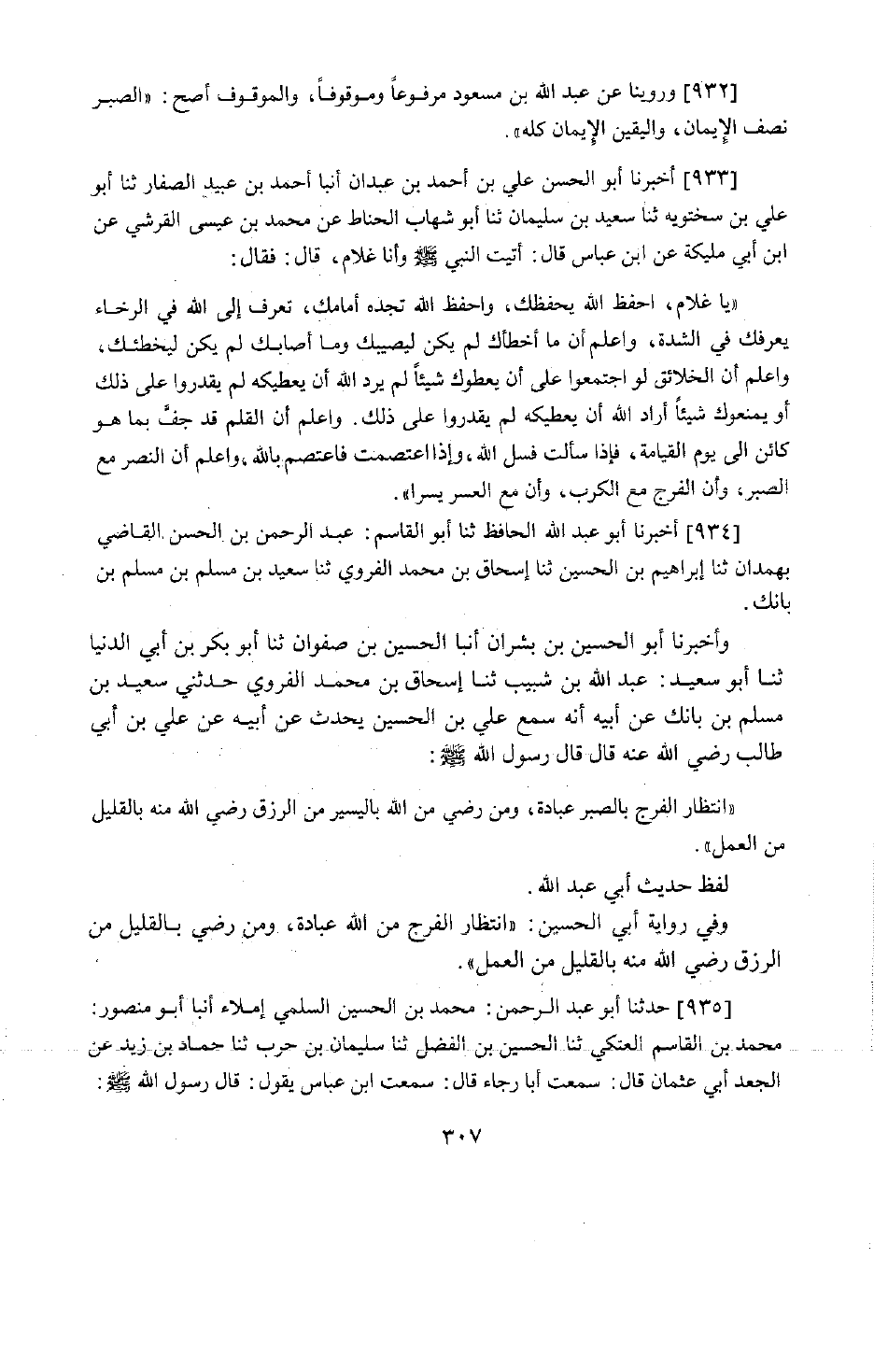 758 - أَخْبَرَنَا أَبُو الْحَسَنِ عَلِيُّ بْنُ أَحْمَدَ بْنِ عَبْدَانَ، أَنْبَأَنَا أَحْمَدُ بْنُ عُبَيْدٍ الصَّفَّارُ، حَدَّثَنَا أَبُو عَلِيِّ بْنُ سَخْتَوَيْهِ، حَدَّثَنَا سَعِيدُ بْنُ سُلَيْمَانَ، حَدَّثَنَا أَبُو شِهَابٍ الْحَنَّاطُ، عَنْ مُحَمَّدِ بْنِ عِيسَى الْقُرَشِيِّ، عَنِ ابْنِ أَبِي مُلَيْكَةَ، عَنِ ابْنِ عَبَّاسٍ قَالَ: أَتَيْتُ النَّبِيَّ صَلَّى اللَّهُ عَلَيْهِ وَسَلَّمَ وَأَنَا غُلَامٌ قَالَ: فَقَالَ: «يَا غُلَامُ، §احْفَظِ اللَّهَ يَحْفَظْكَ، وَاحْفَظِ اللَّهَ تَجِدْهُ أَمَامَكَ، تَعَرَّفْ إِلَى اللَّهِ فِي الرَّخَاءِ يَعْرِفْكَ فِي الشِّدَّةِ، وَاعْلَمْ أَنَّ مَا أَخْطَأَكَ لَمْ يَكُنْ لِيُصِيبَكَ، وَمَا أَصَابَكَ لَمْ يَكُنْ لِيُخْطِئَكَ، وَاعْلَمْ أَنَّ الْخَلَائِقَ لَوِ اجْتَمَعُوا عَلَى أَنْ يُعْطُوكَ شَيْئًا لَمْ يُرِدِ اللَّهُ أَنْ يُعْطِيَكَهُ لَمْ يَقْدِرُوا عَلَى ذَلِكَ، أَوْ يَمْنَعُوكَ شَيْئًا أَرَادَ اللَّهُ أَنْ يُعْطِيَكَهُ لَمْ يَقْدِرُوا عَلَى ذَلِكَ، وَاعْلَمْ أَنَّ الْقَلَمَ جَفَّ بِمَا هُوَ كَائِنٌ إِلَى يَوْمِ الْقِيَامَةِ، فَإِذَا سَأَلْتَ فَسَلِ اللَّهَ، وَإِذَا اعْتَصَمْتَ فَاعْتَصِمْ بِاللَّهِ، وَاعْلَمْ أَنَّ النَّصْرَ مَعَ الصَّبْرِ، وَأَنَّ الْفَرَجَ مَعَ الْكَرْبِ، وَأَنَّ مَعَ الْعُسْرِ يَسِّرًا»