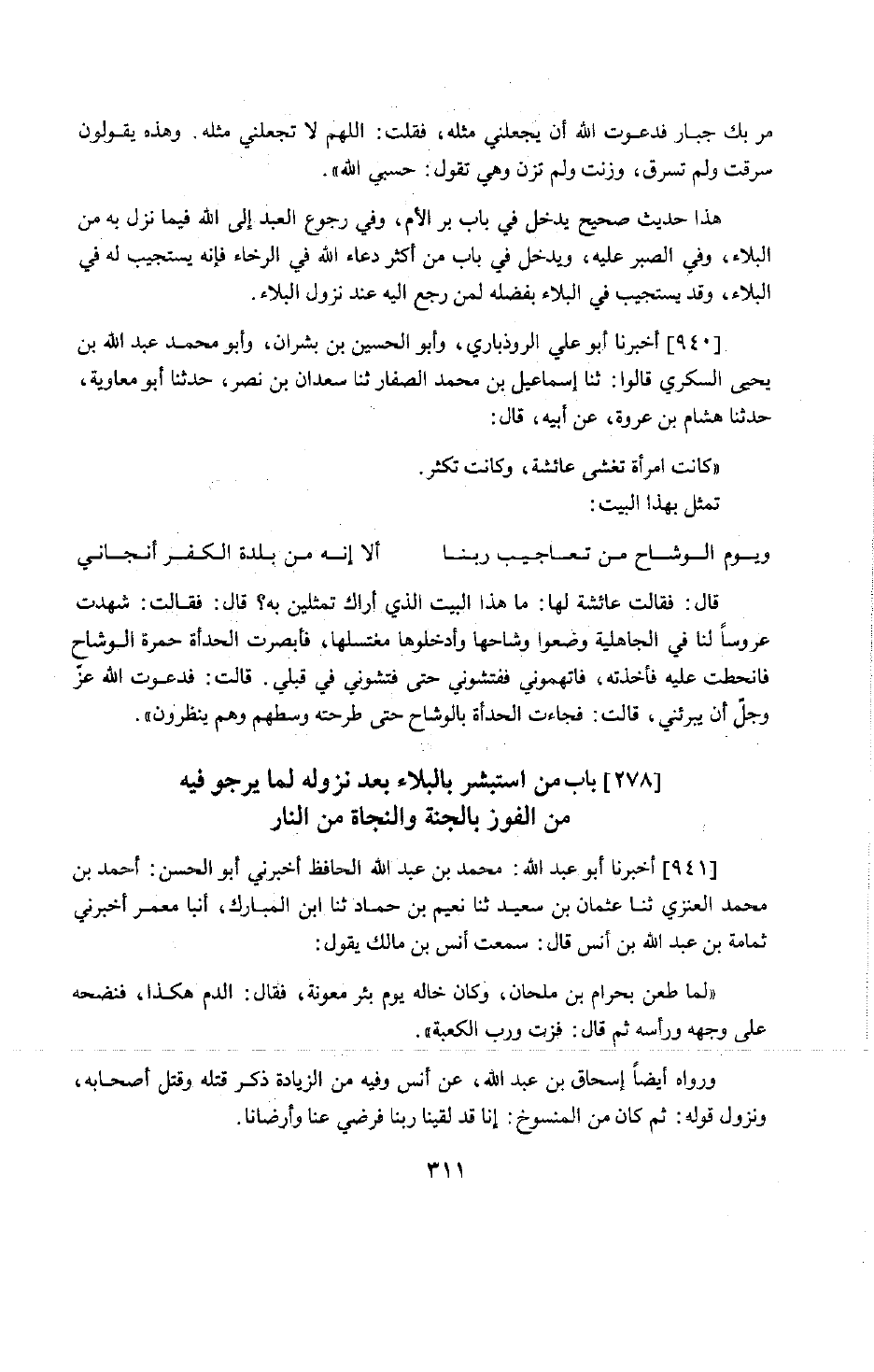 766 - أَخْبَرَنَا أَبُو عَبْدِ اللَّهِ مُحَمَّدُ بْنُ عَبْدِ اللَّهِ الْحَافِظُ، أَخْبَرَنِي أَبُو الْحَسَنِ أَحْمَدُ بْنُ مُحَمَّدٍ الْعَنَزِيُّ، حَدَّثَنَا عُثْمَانُ بْنُ سَعِيدٍ، حَدَّثَنَا نُعَيْمُ بْنُ حَمَّادٍ، حَدَّثَنَا ابْنُ الْمُبَارَكِ، أَنْبَأَنَا مَعْمَرٌ، أَخْبَرَنِي ثُمَامَةُ بْنُ عَبْدِ اللَّهِ بْنِ أَنَسٍ قَالَ: سَمِعْتُ أَنَسَ بْنَ مَالِكٍ يَقُولُ: " §لَمَّا طُعِنَ بِحَرَامِ بْنِ مِلْحَانَ، وَكَانَ خَالَهُ يَوْمَ بِئْرِ مَعُونَةَ، فَقَالَ: الدَّمُ هَكَذَا، فَنَضَحَهُ عَلَى وَجْهِهِ وَرَأْسِهِ، ثُمَّ قَالَ: فُزْتُ وَرَبِّ الْكَعْبَةِ ". وَرَوَاهُ أَيْضًا إِسْحَاقُ بْنُ عَبْدِ اللَّهِ، عَنْ أَنَسٍ، وَفِيهِ مِنَ الزِّيَادَةِ ذِكْرُ قَتْلِهِ وَقَتْلِ أَصْحَابِهِ، وَنُزُولِ قَوْلِهِ: ثُمَّ كَانَ مِنَ الْمَنْسُوخِ: «إِنَّا قَدْ لَقِينَا رَبَّنَا فَرَضِيَ عَنَّا وَأَرْضَانَا»