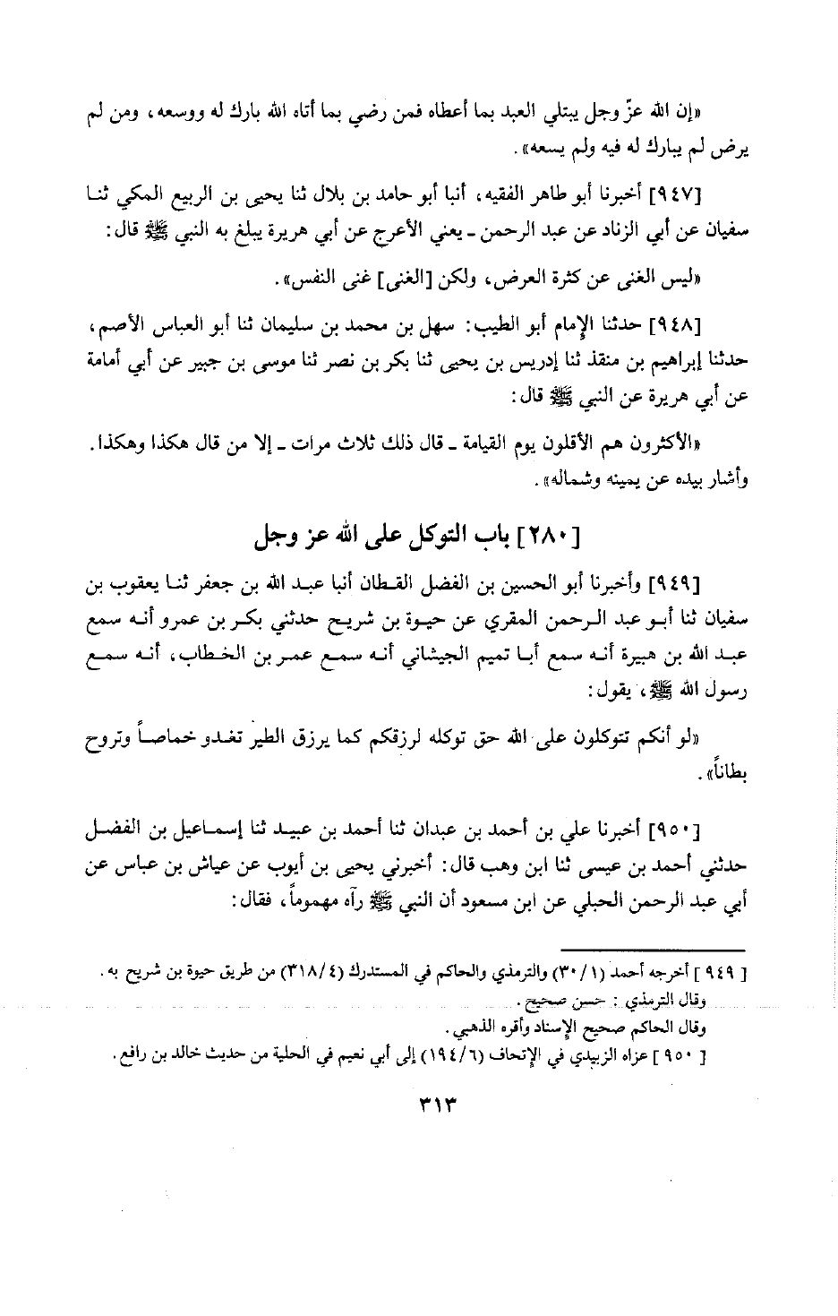 774 - وَأَخْبَرَنَا أَبُو الْحُسَيْنِ بْنُ الْفَضْلِ الْقَطَّانُ، أَنْبَأَنَا عَبْدُ اللَّهِ بْنُ جَعْفَرٍ، حَدَّثَنَا يَعْقُوبُ بْنُ سُفْيَانَ، حَدَّثَنَا أَبُو عَبْدِ الرَّحْمَنِ الْمُقْرِئُ، عَنْ حَيْوَةَ بْنِ شُرَيْحٍ، حَدَّثَنِي بَكْرُ بْنُ عَمْرٍو أَنَّهُ سَمِعَ عَبْدَ اللَّهِ بْنَ هُبَيْرَةَ أَنَّهُ سَمِعَ أَبَا تَمِيمٍ الْجَيْشَانِيَّ، أَنَّهُ سَمِعَ عُمَرَ بْنَ الْخَطَّابِ أَنَّهُ سَمِعَ رَسُولَ اللَّهِ صَلَّى اللَّهُ عَلَيْهِ وَسَلَّمَ يَقُولُ: §«لَوْ أَنَّكُمْ تَتَوَكَّلُونَ عَلَى اللَّهِ حَقَّ تَوَكُّلِهِ لَرَزَقَكُمْ كَمَا يَرْزُقُ الطَّيْرَ تَغْدُو خِمَاصًا وَتَرُوحُ بِطَانًا»
