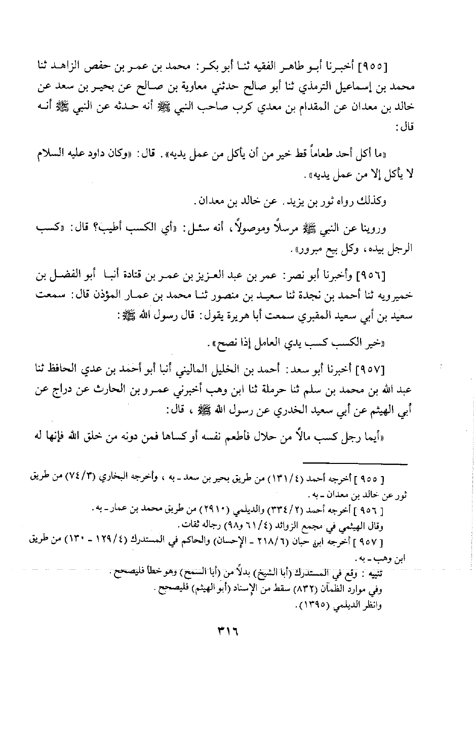 780 - أَخْبَرَنَا أَبُو طَاهِرٍ الْفَقِيهُ، حَدَّثَنَا أَبُو بَكْرٍ مُحَمَّدُ بْنُ عُمَرَ بْنِ حَفْصٍ الزَّاهِدُ، حَدَّثَنَا مُحَمَّدُ بْنُ إِسْمَاعِيلَ التِّرْمِذِيُّ، حَدَّثَنَا أَبُو صَالِحٍ، حَدَّثَنِي مُعَاوِيَةُ بْنُ صَالِحٍ، عَنْ بَحِيرِ بْنِ سَعْدٍ، عَنْ خَالِدِ بْنِ مَعْدَانَ، عَنِ الْمِقْدَامِ بْنِ مَعْدِي كَرِبَ صَاحِبِ النَّبِيِّ صَلَّى اللَّهُ عَلَيْهِ وَسَلَّمَ، أَنَّهُ حَدَّثَهُ عَنِ النَّبِيِّ صَلَّى اللَّهُ عَلَيْهِ وَسَلَّمَ، أَنَّهُ قَالَ: §«مَا أَكَلَ أَحَدٌ طَعَامًا قَطُّ خَيْرٌ مِنْ أَنْ يَأْكُلَ مِنْ عَمَلِ يَدَيْهِ» قَالَ: «كَانَ دَاوُدُ عَلَيْهِ السَّلَامُ لَا يَأْكُلُ إِلَّا مِنْ عَمَلِ يَدَيْهِ» . وَكَذَلِكَ رَوَاهُ ثَوْرُ بْنُ يَزِيدَ، عَنْ خَالِدِ بْنِ مَعْدَانَ، وَرُوِّينَا عَنِ النَّبِيِّ صَلَّى اللَّهُ عَلَيْهِ وَسَلَّمَ مُرْسَلًا وَمَوْصُولًا، أَنَّهُ سُئِلَ: أَيُّ الْكَسْبِ أَطْيَبُ؟ قَالَ: «كَسْبُ الرَّجُلِ بِيَدِهِ، وَكُلُّ بَيْعٍ مَبْرُورٍ»