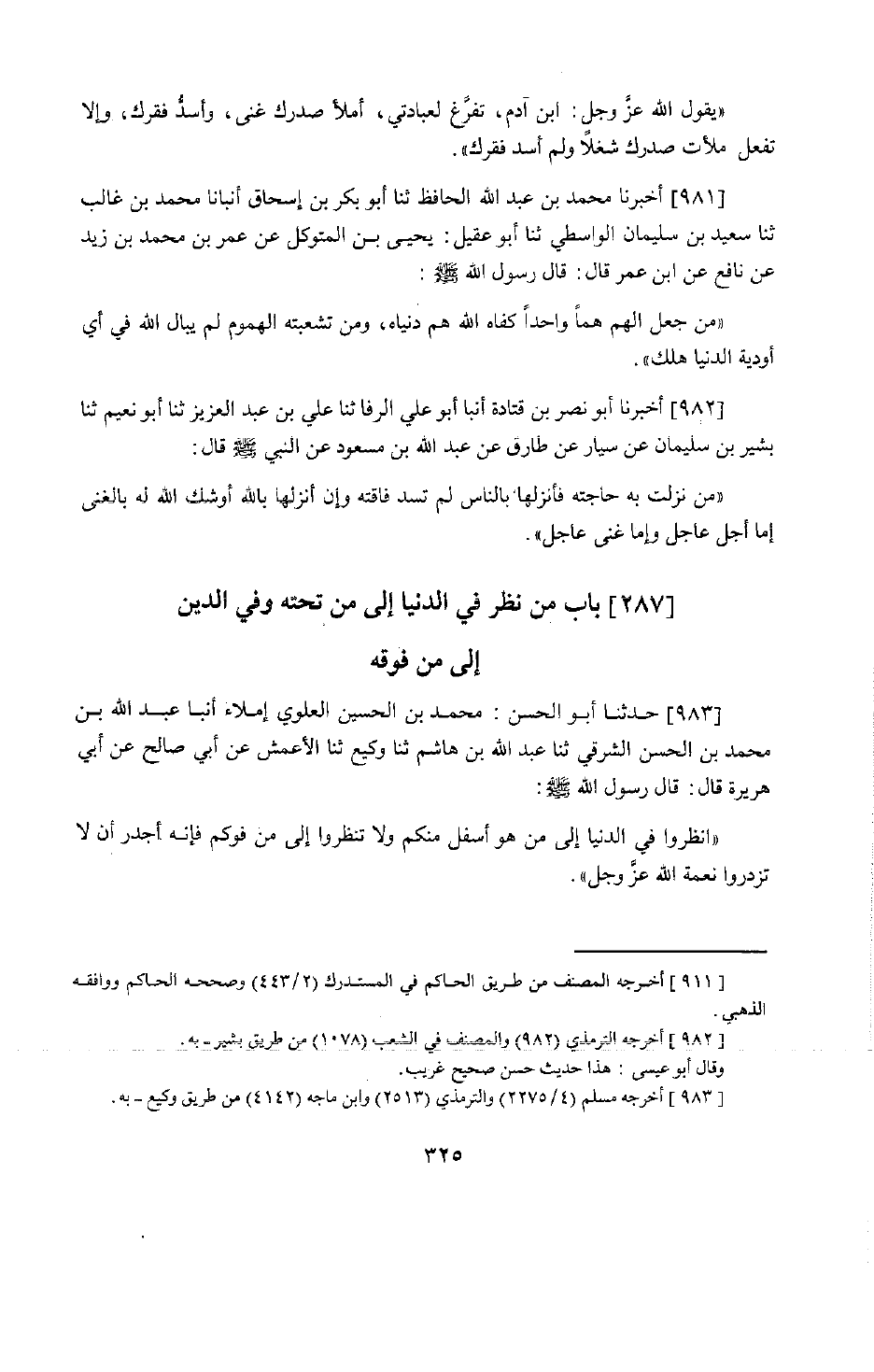 806 - حَدَّثَنَا أَبُو الْحَسَنِ مُحَمَّدُ بْنُ الْحُسَيْنِ الْعَلَوِيُّ إِمْلَاءً، أَنْبَأَنَا عَبْدُ اللَّهِ بْنُ مُحَمَّدِ بْنِ الْحَسَنِ الشَّرْقِيُّ، حَدَّثَنَا عَبْدُ اللَّهِ بْنُ هِشَامٍ، حَدَّثَنَا وَكِيعٌ، حَدَّثَنَا الْأَعْمَشُ، عَنْ أَبِي صَالِحٍ، عَنْ أَبِي هُرَيْرَةَ قَالَ: قَالَ رَسُولُ اللَّهِ صَلَّى اللَّهُ عَلَيْهِ وَسَلَّمَ: §«انْظُرُوا فِي الدُّنْيَا إِلَى مَنْ هُوَ أَسْفَلُ مِنْكُمْ وَلَا تَنْظُرُوا إِلَى مَنْ فَوْقَكُمْ فَإِنَّهُ أَجْدَرُ أَنْ لَا تَزْدَرُوا نِعْمَةَ اللَّهِ عَزَّ وَجَلَّ» ، -[326]- وَرَوَاهُ الْأَعْرَجُ، عَنْ أَبِي هُرَيْرَةَ يَبْلُغُ بِهِ النَّبِيَّ صَلَّى اللَّهُ عَلَيْهِ وَسَلَّمَ قَالَ: «إِذَا نَظَرَ أَحَدُكُمْ إِلَى مَنْ فُضِّلَ عَلَيْهِ فِي الْمَالِ وَالْجِسْمِ فَلْيَنْظُرْ إِلَى مَنْ هُوَ دُونَهُ فِي الْمَالِ وَالْجِسْمِ» . أَخْبَرَنَا أَبُو الْحَسَنِ بْنُ أَبِي عَلِيٍّ السَّقَّا، حَدَّثَنَا أَبُو الْعَبَّاسِ الْأَصَمُّ، حَدَّثَنَا زَكَرِيَّا بْنُ يَحْيَى، حَدَّثَنَا سُفْيَانُ، عَنْ أَبِي الزِّنَادِ، عَنِ الْأَعْرَجِ، فَذَكَرَهُ