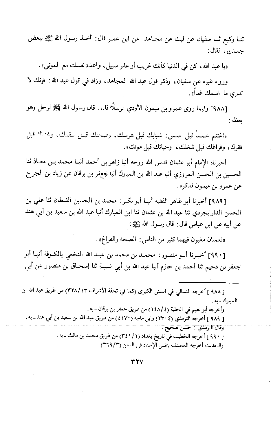 809 - وَفِيمَا رَوَى عَمْرُو بْنُ مَيْمُونٍ الْأَوْدِيُّ، مُرْسَلًا قَالَ: قَالَ رَسُولُ اللَّهِ صَلَّى اللَّهُ عَلَيْهِ وَسَلَّمَ لِرَجُلٍ وَهُوَ يَعِظُهُ: " §اغْتَنِمْ خَمْسًا قَبْلَ خَمْسٍ: شَبَابَكَ قَبْلَ هَرَمِكَ، وَصِحَّتَكَ قَبْلَ سَقَمِكَ، وَغِنَاكَ قَبْلَ فَقْرِكَ، وَفَرَاغَكَ قَبْلَ شُغْلِكَ، وَحَيَاتَكَ قَبْلَ مَوْتِكَ ". أَخْبَرَنَا الْإِمَامُ أَبُو عُثْمَانَ قَدَّسَ اللَّهُ رُوحَهُ، أَنْبَأَنَا زَاهِرُ بْنُ أَحْمَدَ، أَنْبَأَنَا مُحَمَّدُ بْنُ مُعَاذٍ، حَدَّثَنَا الْحُسَيْنُ بْنُ الْحَسَنِ الْمَرْوَزِيُّ، أَنْبَأَنَا عَبْدُ اللَّهِ بْنُ الْمُبَارَكِ، أَنْبَأَنَا جَعْفَرُ بْنُ بُرْقَانَ، عَنْ زِيَادِ بْنِ الْجَرَّاحِ، عَنْ عَمْرِو بْنِ مَيْمُونٍ، فَذَكَرَهُ