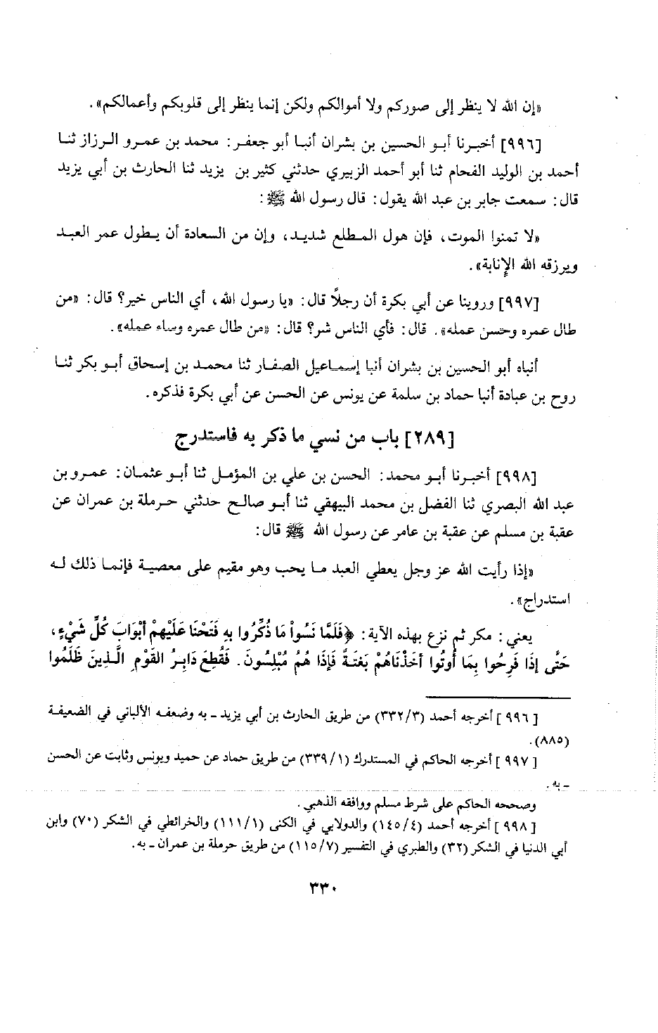819 - أَخْبَرَنَا أَبُو مُحَمَّدٍ الْحَسَنُ بْنُ عَلِيِّ بْنِ الْمُؤَمَّلِ، حَدَّثَنَا أَبُو عُثْمَانَ عَمْرُو بْنُ عَبْدِ اللَّهِ الْبَصْرِيُّ، حَدَّثَنَا الْفَضْلُ بْنُ مُحَمَّدٍ الْبَيْهَقِيُّ، حَدَّثَنَا أَبُو صَالِحٍ، حَدَّثَنِي حَرْمَلَةُ بْنُ عِمْرَانَ، عَنْ عُقْبَةَ بْنِ مُسْلِمٍ، عَنْ عُقْبَةَ بْنِ عَامِرٍ عَنْ رَسُولِ اللَّهِ صَلَّى اللَّهُ عَلَيْهِ وَسَلَّمَ قَالَ: §«إِذَا رَأَيْتَ اللَّهَ عَزَّ وَجَلَّ يُعْطِي الْعَبْدَ مَا يُحِبُّ وَهُوَ مُقِيمٌ عَلَى مَعْصِيَةٍ فَإِنَّمَا ذَلِكَ مِنْهُ لَهُ اسْتِدْرَاجٌ» . يَعْنِي: مَكْرًا، ثُمَّ نَزَعَ بِهَذِهِ الْآيَةِ: فَلَمَّا نَسُوا مَا ذُكِّرُوا بِهِ فَتَحْنَا عَلَيْهِمْ أَبْوَابَ كُلِّ شَيْءٍ، حَتَّى إِذَا فَرِحُوا بِمَا أُوتُوا أَخَذْنَاهُمْ بَغْتَةً فَإِذَا هُمْ مُبْلِسُونَ، فَقُطِعَ دَابِرُ الْقَوْمِ الَّذِينَ ظَلَمُوا. -[331]- وَالْحَمْدُ لِلَّهِ رَبِّ الْعَالَمِينَ