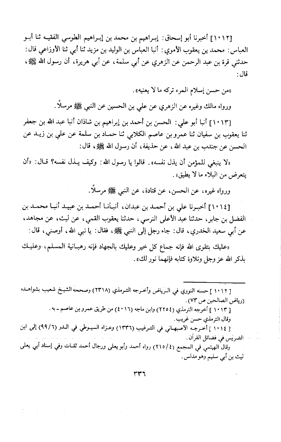 833 - أَخْبَرَنَا أَبُو إِسْحَاقَ إِبْرَاهِيمُ بْنُ مُحَمَّدِ بْنِ إِبْرَاهِيمَ الطُّوسِيُّ الْفَقِيهُ، حَدَّثَنَا أَبُو الْعَبَّاسِ مُحَمَّدُ بْنُ يَعْقُوبَ الْأُمَوِيُّ، أَنْبَأَنَا الْعَبَّاسُ بْنُ الْوَلِيدِ بْنِ مَزْيَدَ، حَدَّثَنَا أَبِي، حَدَّثَنَا الْأَوْزَاعِيُّ قَالَ: حَدَّثَنِي قُرَّةُ بْنُ عَبْدِ الرَّحْمَنِ، عَنِ الزُّهْرِيِّ، عَنْ أَبِي سَلَمَةَ، عَنْ أَبِي هُرَيْرَةَ أَنَّ رَسُولَ اللَّهِ صَلَّى اللَّهُ عَلَيْهِ وَسَلَّمَ قَالَ: §«مِنْ حُسْنِ إِسْلَامِ الْمَرْءِ تَرْكُهُ مَا لَا يَعْنِيهِ» . وَرَوَاهُ مَالِكٌ وَغَيْرُهُ، عَنِ الزُّهْرِيِّ، عَنْ عَلِيِّ بْنِ الْحُسَيْنِ عَنِ النَّبِيِّ صَلَّى اللَّهُ عَلَيْهِ وَسَلَّمَ مُرْسَلًا