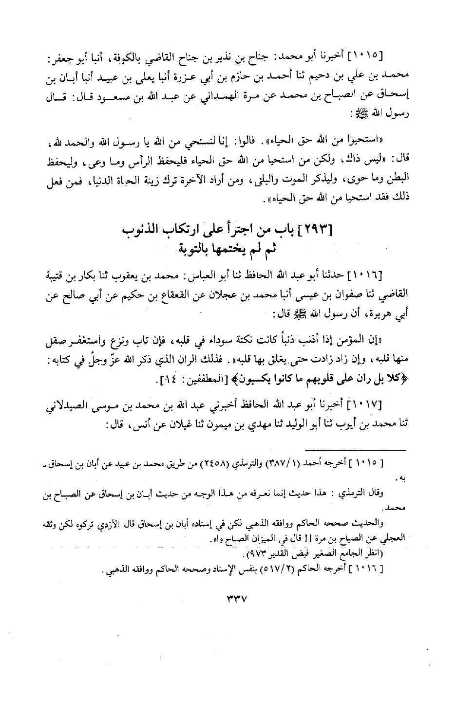 837 - حَدَّثَنَا أَبُو عَبْدِ اللَّهِ الْحَافِظُ، حَدَّثَنَا أَبُو الْعَبَّاسِ مُحَمَّدُ بْنُ يَعْقُوبَ، حَدَّثَنَا بَكَّارُ بْنُ قُتَيْبَةَ الْقَاضِي، حَدَّثَنَا صَفْوَانُ بْنُ عِيسَى، أَنْبَأَنَا مُحَمَّدُ بْنُ عَجْلَانَ، عَنِ الْقَعْقَاعِ بْنِ حَكِيمٍ، عَنْ أَبِي صَالِحٍ، عَنْ أَبِي هُرَيْرَةَ أَنَّ رَسُولَ اللَّهِ صَلَّى اللَّهُ عَلَيْهِ وَسَلَّمَ قَالَ: «إِنَّ §الْمُؤْمِنَ إِذَا أَذْنَبَ ذَنْبًا كَانَتْ نُكْتَةً سَوْدَاءَ فِي قَلْبِهِ، فَإِنْ تَابَ وَنَزَعَ وَاسْتَغْفَرَ صُقِلَ مِنْهَا قَلْبُهُ، وَإِنْ زَادَ زَادَتْ حَتَّى يُغْلَقَ بِهَا قَلْبُهُ» . فَذَلِكَ الرَّانُ الَّذِي ذَكَرَ اللَّهُ عَزَّ وَجَلَّ فِي كِتَابِهِ: {كَلَّا بَلْ رَانَ عَلَى قُلُوبِهِمْ مَا كَانُوا يَكْسِبُونَ} [المطففين: 14]