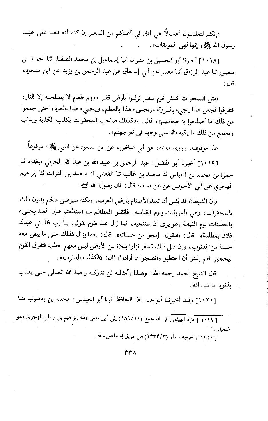 840 - أَخْبَرَنَا أَبُو الْفَضْلِ عَبْدُ الرَّحْمَنِ بْنُ عُبَيْدِ اللَّهِ بْنِ عَبْدِ اللَّهِ الْحُرْفِيُّ، بِبَغْدَادَ، حَدَّثَنَا حَمْزَةُ بْنُ مُحَمَّدِ بْنِ الْعَبَّاسِ، حَدَّثَنَا مُحَمَّدُ بْنُ غَالِبٍ، حَدَّثَنَا الْقَعْنَبِيُّ، حَدَّثَنَا مُحَمَّدُ بْنُ الْفُرَاتِ، حَدَّثَنَا إِبْرَاهِيمُ الْهَجَرِيُّ، عَنْ أَبِي الْأَحْوَصِ، عَنِ ابْنِ مَسْعُودٍ قَالَ: قَالَ رَسُولُ اللَّهِ صَلَّى اللَّهُ عَلَيْهِ وَسَلَّمَ: " إِنَّ §الشَّيْطَانَ قَدْ يَئِسَ أَنْ تُعْبَدَ الْأَصْنَامُ بِأَرْضِ الْعَرَبِ، وَلَكِنَّهُ سَيَرْضَى مِنْكُمْ بِدُونِ ذَلِكَ بِالْمُحَقَّرَاتِ، وَهِيَ الْمُوبِقَاتُ يَوْمَ الْقِيَامَةِ. فَاتَّقُوا الْمَظَالِمَ مَا اسْتَطَعْتُمْ فَإِنَّ الْعَبْدَ يَجِيءُ بِالْحَسَنَاتِ يَوْمَ الْقِيَامَةِ وَهُوَ يَرَى أَنْ سَتُنْجِيهِ، فَمَا زَالَ عَبْدٌ يَقُومُ يَقُولُ: يَا رَبِّ ظَلَمَنِي عَبْدُكَ فُلَانٌ بِمَظْلِمَةٍ ". قَالَ: فَيَقُولُ: «امْحُوا مِنْ حَسَنَاتِهِ» . قَالَ: «فَمَا يَزَالُ كَذَلِكَ حَتَّى مَا يَبْقَى مَعَهُ حَسَنَةٌ مِنَ الذُّنُوبِ، وَإِنَّ مَثَلَ ذَلِكَ كَسَفْرٍ نَزَلُوا بِفَلَاةٍ مِنَ الْأَرْضِ لَيْسَ مَعَهُمْ حَطَبٌ فَتَفَرَّقَ الْقَوْمُ لِيَحْتَطِبُوا فَلَمْ يَلْبَثُوا أَنِ احْتَطَبُوا وَأَنْضَجُوا مَا أَرَادُوا» . قَالَ: «فَكَذَلِكَ الذُّنُوبُ» . قَالَ الشَّيْخُ أَحْمَدُ رَحِمَهُ اللَّهُ: وَهَذَا وَأَمْثَالُهُ لَنْ تُدْرِكَهُ رَحْمَةُ اللَّهِ تَعَالَى حَتَّى يُعَذَّبَ بِذُنُوبِهِ مَا شَاءَ اللَّهُ