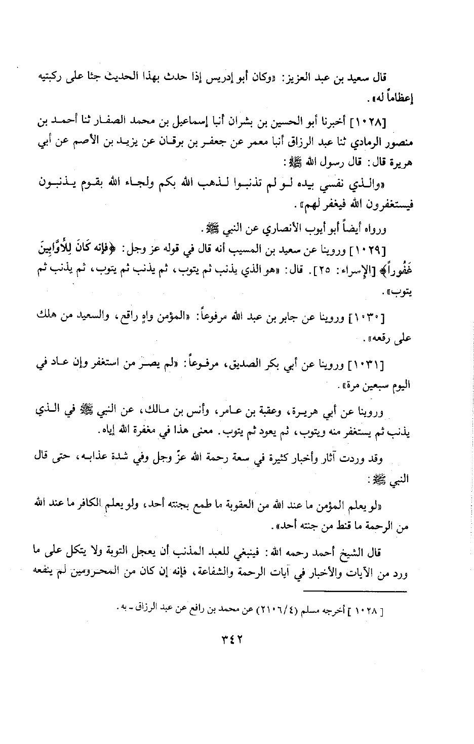 848 - أَخْبَرَنَا أَبُو الْحُسَيْنِ بْنُ بِشْرَانَ، أَنْبَأَنَا إِسْمَاعِيلُ بْنُ مُحَمَّدٍ الصَّفَّارُ، حَدَّثَنَا أَحْمَدُ بْنُ مَنْصُورٍ الرَّمَادِيُّ، حَدَّثَنَا عَبْدُ الرَّزَّاقِ، أَنْبَأَنَا مَعْمَرٌ، عَنْ جَعْفَرِ بْنِ بُرْقَانَ، عَنْ يَزِيدَ بْنِ الْأَصَمِّ، عَنْ أَبِي هُرَيْرَةَ قَالَ: قَالَ رَسُولُ اللَّهِ صَلَّى اللَّهُ عَلَيْهِ وَسَلَّمَ: «وَالَّذِي نَفْسِي بِيَدِهِ §لَوْ لَمْ تُذْنِبُوا لَذَهَبَ اللَّهُ بِكُمْ وَلَجَاءَ اللَّهُ بِقَوْمٍ يُذْنِبُونَ فَيَسْتَغْفِرُونَ اللَّهَ فَيَغْفِرُ لَهُمْ» . وَرُوِّينَا عَنْ سَعِيدِ بْنِ الْمُسَيِّبِ أَنَّهُ قَالَ فِي قَوْلِهِ عَزَّ وَجَلَّ: إِنَّهُ كَانَ لِلْأَوَّابِينَ غَفُورًا. قَالَ: «هُوَ الَّذِي يُذْنِبُ ثُمَّ يَتُوبُ، ثُمَّ يُذْنِبُ ثُمَّ يَتُوبُ، ثُمَّ يُذْنِبُ ثُمَّ يَتُوبُ» ، وَرُوِّينَا عَنْ جَابِرِ بْنِ عَبْدِ اللَّهِ مَرْفُوعًا: «الْمُؤْمِنُ وَاهٍ رَاقِعٌ، وَالسَّعِيدُ مَنْ هَلَكَ عَلَى رُقْعَةٍ» . وَرُوِّينَا عَنْ أَبِي بَكْرٍ الصِّدِّيقِ مَرْفُوعًا: «لَمْ يُصِرَّ مَنِ اسْتَغْفَرَ وَإِنْ عَادَ فِي الْيَوْمِ سَبْعِينَ مَرَّةً» ، وَرُوِّينَا عَنْ أَبِي هُرَيْرَةَ، وَعُقْبَةَ بْنِ عَامِرٍ، وَأَنَسِ بْنِ مَالِكٍ، عَنِ النَّبِيِّ صَلَّى اللَّهُ عَلَيْهِ وَسَلَّمَ فِي الَّذِي يُذْنِبُ ثُمَّ يَسْتَغْفِرُ مِنْهُ وَيَتُوبُ، ثُمَّ يَعُودُ ثُمَّ يَتُوبُ. مَعْنَى هَذَا فِي مَغْفِرَةِ اللَّهِ إِيَّاهُ. وَقَدْ وَرَدَتْ آثَارٌ وَأَخْبَارٌ كَثِيرَةٌ فِي سِعَةِ رَحْمَةِ اللَّهِ عَزَّ وَجَلَّ فِي شِدَّةِ عَذَابِهِ، حَتَّى قَالَ النَّبِيُّ صَلَّى اللَّهُ عَلَيْهِ وَسَلَّمَ: «لَوْ يَعْلَمُ الْمُؤْمِنُ مَا عِنْدَ اللَّهِ مِنَ الْعُقُوبَةِ مَا طَمَعَ بِجَنَّتِهِ أَحَدٌ، وَلَوْ يَعْلَمُ الْكَافِرُ مَا عِنْدَ اللَّهِ مِنَ الرَّحْمَةِ مَا قَنَطَ مِنْ جَنَّتِهِ أَحَدٌ» . قَالَ الشَّيْخُ أَحْمَدَ رَحِمَهُ اللَّهُ: فَيَنْبَغِي لِلْعَبْدِ الْمُذْنِبِ أَنْ يُعَجِّلَ التَّوْبَةَ، وَلَا يَتَّكِلَ عَلَى مَا وَرَدَ مِنَ الْآيَاتِ وَالْأَخْبَارِ فِي آيَاتِ الرَّحْمَةِ وَالشَّفَاعَةِ، فَإِنَّهُ إِنْ كَانَ مِنَ الْمَحْرُومِينَ لَمْ يَنْفَعْهُ -[343]- كَثْرَتُهَا لِلْغَيْرِ، وَلَا يَيْأَسُ فَالْإِيَاسُ مِنْ رَحْمَةِ اللَّهِ وَشَفَاعَةِ الشَّافِعِينَ مِنَ الْكَبَائِرِ، وَلْيَكُنْ خَائِفًا رَاجِيًا يَرْجُو رَحْمَتَهُ، وَيَخَافُ عَذَابَهُ