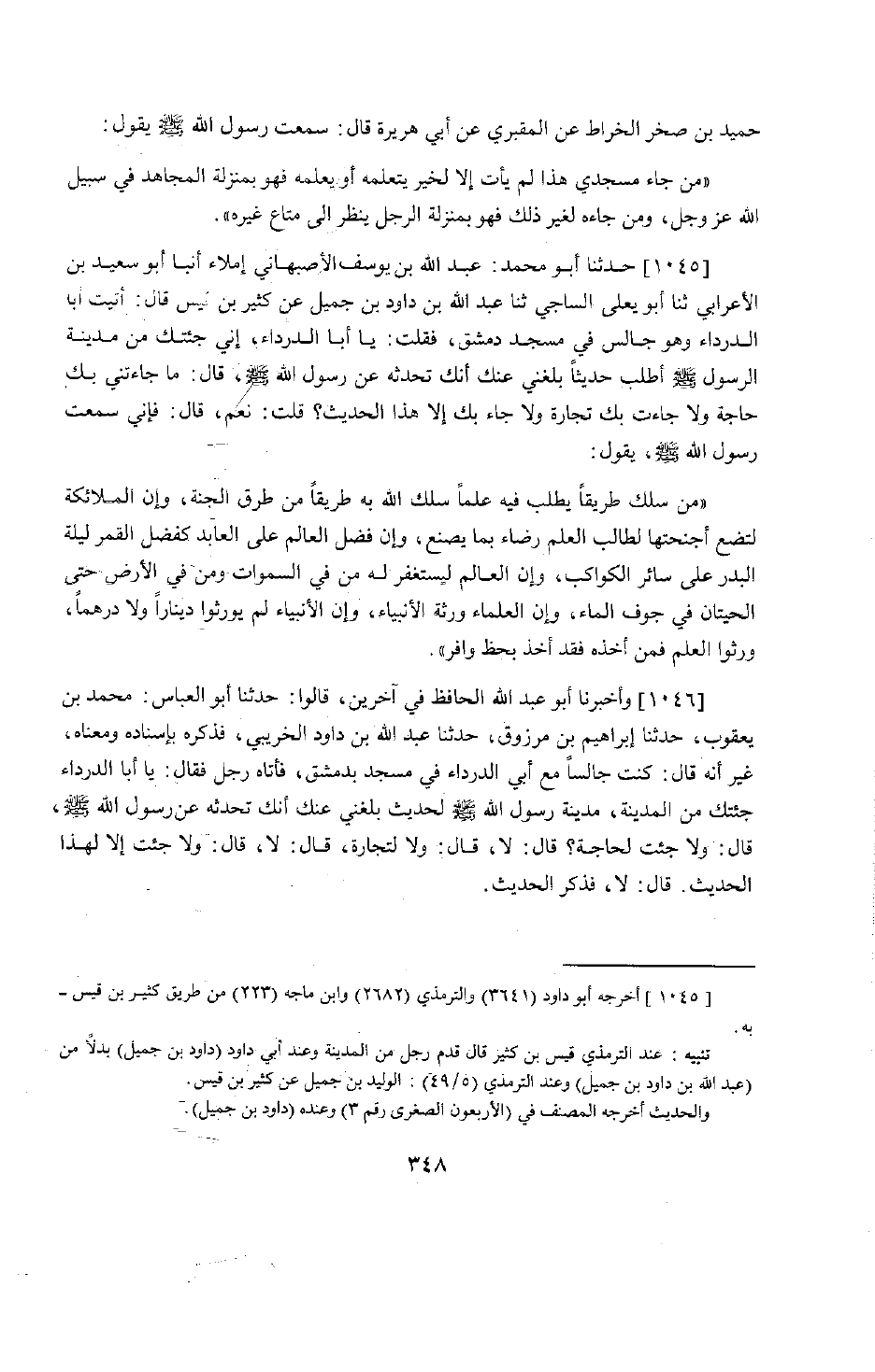 862 - حَدَّثَنَا أَبُو مُحَمَّدٍ عَبْدُ اللَّهِ بْنُ يُوسُفَ الْأَصْبَهَانِيُّ إِمْلَاءً، أَنْبَأَنَا أَبُو سَعِيدِ بْنُ الْأَعْرَابِيِّ، حَدَّثَنَا أَبُو يَعْلَى السَّاجِيُّ، حَدَّثَنَا عَبْدُ اللَّهِ بْنُ دَاوُدَ بْنِ جَمِيلٍ، عَنْ كَثِيرِ بْنِ قَيْسٍ قَالَ: أَتَيْتُ أَبَا الدَّرْدَاءِ وَهُوَ جَالِسٌ فِي مَسْجِدِ دِمَشْقَ، فَقُلْتُ: يَا أَبَا الدَّرْدَاءِ، إِنِّي جِئْتُكَ مِنْ مَدِينَةِ الرَّسُولِ صَلَّى اللَّهُ عَلَيْهِ وَسَلَّمَ أَطْلُبُ حَدِيثًا بَلَغَنِي عَنْكَ أَنَّكَ تُحَدِّثُهُ عَنْ رَسُولِ اللَّهِ صَلَّى اللَّهُ عَلَيْهِ وَسَلَّمَ قَالَ: مَا جَاءَتْنِي بِكَ حَاجَةٌ وَلَا جَاءَتْ بِكَ تِجَارَةٌ وَلَا جَاءَ بِكَ إِلَّا هَذَا الْحَدِيثُ؟ قُلْتُ: نَعَمْ قَالَ: فَإِنِّي سَمِعْتُ رَسُولَ اللَّهِ صَلَّى اللَّهُ عَلَيْهِ وَسَلَّمَ يَقُولُ: §«مَنْ سَلَكَ طَرِيقًا يَطْلُبُ فِيهِ عِلْمًا سَلَكَ اللَّهُ بِهِ طَرِيقًا مِنْ طُرُقِ الْجَنَّةِ، وَإِنَّ الْمَلَائِكَةَ لَتَضَعُ أَجْنِحَتَهَا لِطَالِبِ الْعِلْمِ رِضَاءً بِمَا يَصْنَعُ، وَإِنَّ فَضْلَ الْعَالِمِ عَلَى الْعَابِدِ كَفَضْلِ الْقَمَرِ لَيْلَةَ الْبَدْرِ عَلَى سَائِرِ الْكَوَاكِبِ، وَإِنَّ الْعَالِمَ لَيَسْتَغْفِرُ لَهُ مَنْ فِي السَّمَوَاتِ وَمَنْ فِي الْأَرْضِ حَتَّى الْحِيتَانُ فِي جَوْفٍ مِنَ الْمَاءِ، وَإِنَّ الْعُلَمَاءَ وَرَثَةُ الْأَنْبِيَاءِ، وَإِنَّ الْأَنْبِيَاءَ لَمْ يُوَرِّثُوا دِينَارًا وَلَا دِرْهَمًا، وَرَّثُوا الْعِلْمَ فَمَنْ أَخَذَهُ فَقَدْ أَخَذَ بِحَظٍّ وَافِرٍ» . وَأَخْبَرَنَا أَبُو عَبْدِ اللَّهِ الْحَافِظُ، فِي آخَرِينَ، قَالُوا: حَدَّثَنَا أَبُو الْعَبَّاسِ مُحَمَّدُ بْنُ يَعْقُوبَ، حَدَّثَنَا إِبْرَاهِيمُ بْنُ مَرْزُوقٍ، حَدَّثَنَا عَبْدُ اللَّهِ بْنُ دَاوُدَ الْخُرَيْبِيُّ، فَذَكَرَهُ بِإِسْنَادِهِ وَمَعْنَاهُ، غَيْرَ أَنَّهُ قَالَ: كُنْتُ جَالِسًا مَعَ أَبِي الدَّرْدَاءِ فِي مَسْجِدٍ بِدِمَشْقَ، فَأَتَاهُ رَجُلٌ فَقَالَ: يَا أَبَا الدَّرْدَاءِ جِئْتُكَ مِنَ الْمَدِينَةِ، مَدِينَةِ رَسُولِ اللَّهِ صَلَّى اللَّهُ عَلَيْهِ وَسَلَّمَ لِحَدِيثٍ بَلَغَنِي عَنْكَ أَنَّكَ تُحَدِّثُهُ عَنْ رَسُولِ اللَّهِ صَلَّى اللَّهُ عَلَيْهِ وَسَلَّمَ قَالَ: وَلَا جِئْتَ لِحَاجَةٍ؟ قَالَ: لَا، قَالَ: وَلَا لِتِجَارَةٍ؟ قَالَ: لَا، قَالَ: وَلَا جِئْتَ إِلَّا لِهَذَا الْحَدِيثِ؟ قَالَ: لَا، فَذَكَرَ الْحَدِيثَ