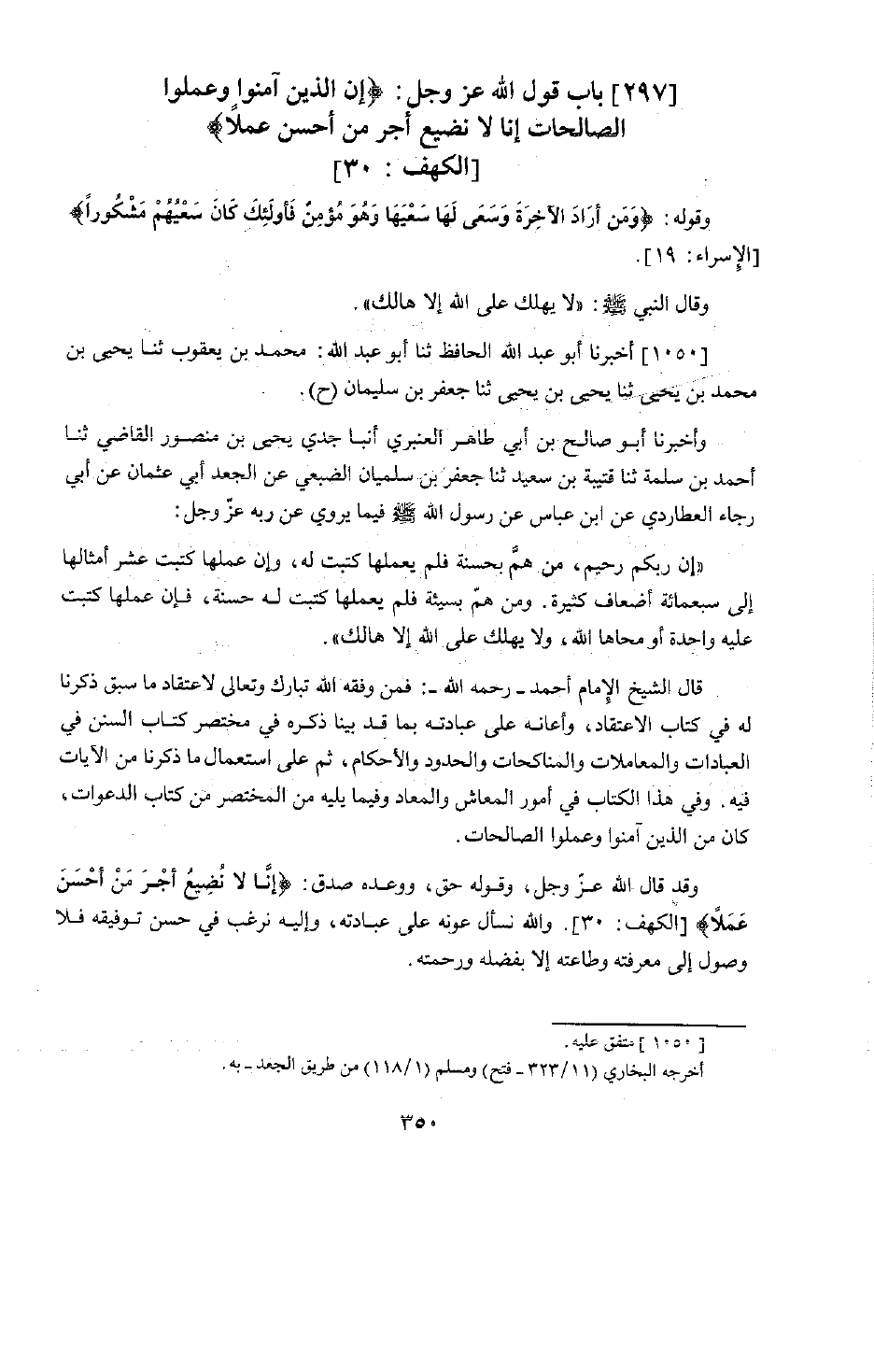 §بَابُ قَوْلِ اللَّهِ عَزَّ وَجَلَّ: {إِنَّ الَّذِينَ آمَنُوا وَعَمِلُوا الصَّالِحَاتِ إِنَّا لَا نُضِيعُ أَجْرَ مَنْ أَحْسَنَ عَمَلًا} [الكهف: 30] وَقَوْلُهُ: {وَمَنْ أَرَادَ الْآخِرَةَ وَسَعَى لَهَا سَعْيَهَا وَهُوَ مُؤْمِنٌ فَأُولَئِكَ كَانَ سَعْيُهُمْ مَشْكُورًا} [الإسراء: 19] . وَقَالَ النَّبِيِّ صَلَّى اللَّهُ عَلَيْهِ وَسَلَّمَ: «لَا يَهْلِكُ عَلَى اللَّهِ إِلَّا هَالِكٌ» .