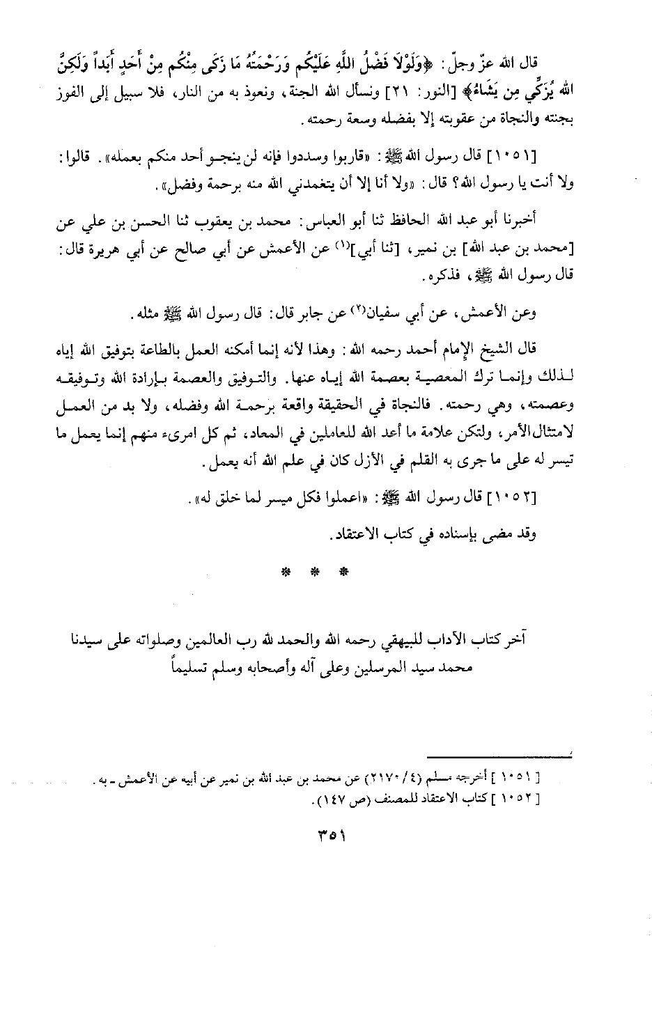 866 - قَالَ رَسُولُ اللَّهِ صَلَّى اللَّهُ عَلَيْهِ وَسَلَّمَ: §«قَارِبُوا وَسَدِّدُوا فَإِنَّهُ لَنْ يَنْجُوَ أَحَدٌ مِنْكُمْ بِعَمَلِهِ» . قَالُوا: وَلَا أَنْتَ يَا رَسُولَ اللَّهِ؟ قَالَ: «وَلَا أَنَا إِلَّا أَنْ يَتَغَمَّدَنِيَ اللَّهُ مِنْهُ بِرَحْمَةٍ وَفَضْلٍ» . أَخْبَرَنَا أَبُو عَبْدِ اللَّهِ الْحَافِظُ، حَدَّثَنَا أَبُو الْعَبَّاسِ مُحَمَّدُ بْنُ يَعْقُوبَ، حَدَّثَنَا الْحَسَنُ بْنُ عَلِيِّ بْنِ مُحَمَّدٍ عَنْ عَبْدِ اللَّهِ بْنِ نُمَيْرٍ، عَنِ الْأَعْمَشِ، عَنْ أَبِي صَالِحٍ، عَنْ أَبِي هُرَيْرَةَ قَالَ: قَالَ رَسُولُ اللَّهِ صَلَّى اللَّهُ عَلَيْهِ وَسَلَّمَ، فَذَكَرَهُ. وَعَنِ الْأَعْمَشِ، عَنْ أَبِي سَعِيدٍ، عَنْ جَابِرٍ قَالَ: قَالَ رَسُولُ اللَّهِ صَلَّى اللَّهُ عَلَيْهِ وَسَلَّمَ مِثْلَهُ. قَالَ الشَّيْخُ الْإِمَامُ أَحْمَدُ رَحِمَهُ اللَّهُ: وَهَذَا لِأَنَّهُ إِنَّمَا أَمْكَنَهُ الْعَمَلُ بِالطَّاعَةِ بِتَوْفِيقِ اللَّهِ إِيَّاهُ لِذَلِكَ وَإِنَّمَا تَرَكَ الْمَعْصِيَةَ بِعِصْمَةِ اللَّهِ إِيَّاهُ عَنْهَا. وَالتَّوْفِيقُ وَالْعِصْمَةُ بِإِرَادَةِ اللَّهِ وَتَوْفِيقِهِ وَعِصْمَتِهِ، وَهِيَ رَحْمَتُهُ. فَالنَّجَاةُ فِي الْحَقِيقَةِ وَاقِعَةٌ بِرَحْمَةِ اللَّهِ وَفَضْلِهِ، وَلَا بُدَّ مِنَ الْعَمَلِ لِامْتِثَالِ الْأَمْرِ، وَلْتَكُنْ عَلَامَةُ مَا أَعَدَّ اللَّهُ لِلْعَامِلِينَ فِي الْمَعَادِ، ثُمَّ كُلُّ امْرِئٍ مِنْهُمْ إِنَّمَا يَعْمَلُ مَا تَيَسَّرَ لَهُ عَلَى مَا جَرَى بِهِ الْقَلَمُ فِي الْأَزَلِ كَانَ فِي عِلْمِ اللَّهِ أَنَّهُ يَعْمَلُ. قَالَ رَسُولُ اللَّهِ صَلَّى اللَّهُ عَلَيْهِ وَسَلَّمَ: «اعْمَلُوا فَكُلٌّ مُيَسَّرٌ لِمَا خُلِقَ لَهُ» . وَقَدْ مَضَى بِإِسْنَادِهِ فِي كِتَابِ الِاعْتِقَادِ