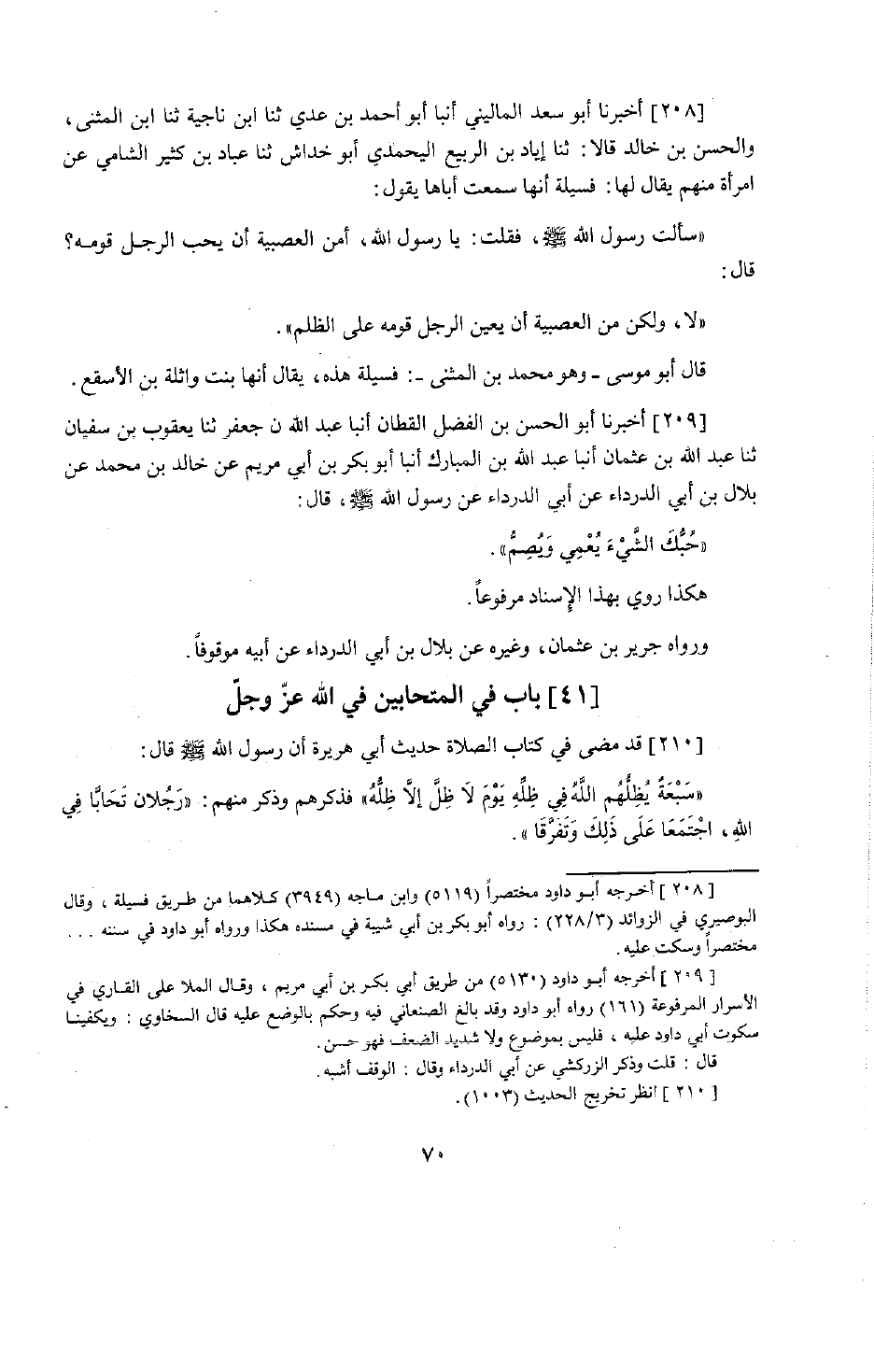 171 - أَخْبَرَنَا أَبُو سَعْدٍ الْمَالِينِيُّ، أَنْبَأَنَا أَبُو أَحْمَدَ بْنُ عَدِيٍّ، حَدَّثَنَا ابْنُ نَاجِيَةَ، حَدَّثَنَا ابْنُ الْمُثَنَّى وَالْحَسَنُ بْنُ خَالِدٍ قَالَا: حَدَّثَنَا زِيَادُ بْنُ الرَّبِيعِ الْيَحْمَدِيُّ أَبُو خِدَاشٍ، حَدَّثَنَا عَبَّادُ بْنُ كَثِيرٍ الشَّامِيُّ، عَنِ امْرَأَةٍ مِنْهُمْ يُقَالَ لَهَا فُسَيْلَةُ أَنَّهَا سَمِعَتْ أَبَاهَا يَقُولُ: سَأَلْتُ رَسُولَ اللَّهِ صَلَّى اللَّهُ عَلَيْهِ وَسَلَّمَ فَقُلْتُ: يَا رَسُولَ اللَّهِ، أَمِنَ الْعَصَبِيَّةِ أَنْ يُحِبَّ الرَّجُلُ قَوْمَهُ؟ قَالَ: «لَا، وَلَكِنْ §مِنَ الْعَصَبِيَّةِ أَنْ يُعِينَ الرَّجُلُ قَوْمَهُ عَلَى الظُّلْمِ» . قَالَ أَبُو مُوسَى: فُسَيْلَةُ هَذِهِ، يُقَالُ أَنَّهَا بِنْتُ وَاثِلَةَ بْنِ الْأَسْقَعِ