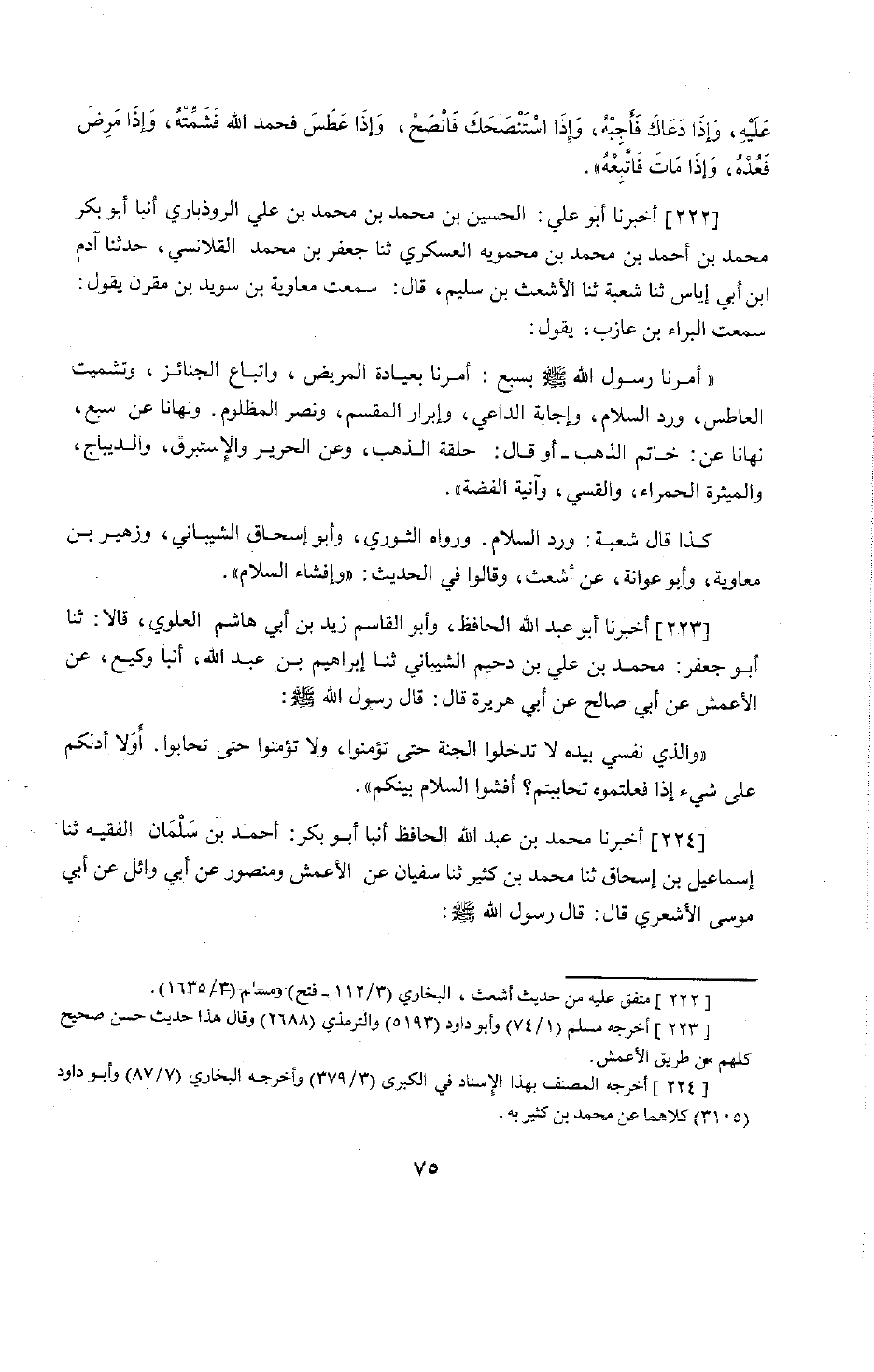 184 - أَخْبَرَنَا أَبُو عَلِيٍّ الْحُسَيْنُ بْنُ مُحَمَّدِ بْنِ مُحَمَّدِ بْنِ عَلِيٍّ الرُّوذْبَارِيُّ، أَنْبَأَنَا أَبُو بَكْرٍ مُحَمَّدُ بْنُ أَحْمَدَ بْنِ مُحَمَّدِ بْنِ مَحْمَوَيْهِ الْعَسْكَرِيُّ، حَدَّثَنَا جَعْفَرُ بْنُ مُحَمَّدٍ الْقَلَانِسِيُّ، حَدَّثَنَا آدَمُ بْنُ إِيَاسٍ، حَدَّثَنَا شُعْبَةُ، حَدَّثَنَا الْأَشْعَثُ بْنُ سُلَيْمٍ قَالَ: سَمِعْتُ مُعَاوِيَةَ بْنَ سُوَيْدِ بْنِ مُقَرِّنٍ يَقُولُ: سَمِعْتُ الْبَرَاءَ بْنَ عَازِبٍ يَقُولُ: " أَمَرَنَا رَسُولُ اللَّهِ صَلَّى اللَّهُ عَلَيْهِ وَسَلَّمَ بِسَبْعٍ: §أَمَرَنَا بِعِيَادَةِ الْمَرِيضِ، وَاتِّبَاعِ الْجَنَائِزِ، وَتَشْمِيتِ الْعَاطِسِ، وَرَدِّ السَّلَامِ، وَإِجَابَةِ الدَّاعِي، وَإِبْرَارِ الْقَسَمِ، وَنَصْرِ الْمَظْلُومِ، وَنَهَانَا عَنْ سَبْعٍ، نَهَانَا عَنْ خَاتَمِ الذَّهَبِ، أَوْ قَالَ: حَلْقَةِ الذَّهَبِ، وَعَنِ الْحَرِيرِ وَالْإِسْتَبْرَقِ، وَالدِّيبَاجِ، وَالْمِيثَرَةِ الْحَمْرَاءِ، وَالْقَسِّيِّ، وَآنِيَةِ الْفِضَّةِ. كَذَا قَالَ شُعْبَةُ: «وَرَدِّ السَّلَامِ» . وَرَوَاهُ الثَّوْرِيُّ وَأَبُو إِسْحَاقَ الشَّيْبَانِيُّ، وَزُهَيْرُ بْنُ مُعَاوِيَةَ وَأَبُو عَوَانَةَ، عَنِ الْأَشْعَثِ، وَقَالُوا فِي الْحَدِيثِ: «وَإِفْشَاءِ السَّلَامِ»