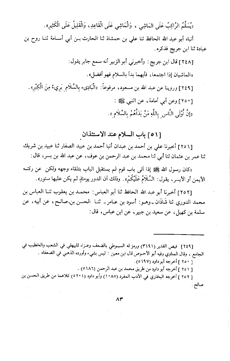 206 - وَأَخْبَرَنَا أَبُو عَبْدِ اللَّهِ الْحَافِظُ، حَدَّثَنَا عَلِيُّ بْنُ حَمْشَاذٍ، حَدَّثَنَا الْحَارِثُ بْنِ أَبِي أُسَامَةَ، حَدَّثَنَا رَوْحُ بْنُ عُبَادَةَ، حَدَّثَنَا ابْنُ جُرَيْج، فَذَكَرَهُ. قَالَ ابْنُ جَرِيرٍ: وَأَخْبَرَنِي أَبُو الزُّبَيْرِ أَنَّهُ سَمِعَ جَابِرًا يَقُولُ: «§الْمَاشِيَانِ إِذَا اجْتَمَعَا، فَأَيُّهُمَا بَدَأَ بِالسَّلَامِ فَهُوَ أَفْضَلُ» . وَرُوِّينَا عَنْ عَبْدِ اللَّهِ بْنِ مَسْعُودٍ، مَرْفُوعًا: «الْبَادِي بِالسَّلَامِ بَرِيءٌ مِنَ الْكِبْرِ» . وَعَنْ أَبِي أُمَامَةَ، عَنِ النَّبِيِّ صَلَّى اللَّهُ عَلَيْهِ وَسَلَّمَ: «إِنَّ أَوْلَى النَّاسِ بِاللَّهِ مَنْ بَدَأَهُمْ بِالسَّلَامِ»