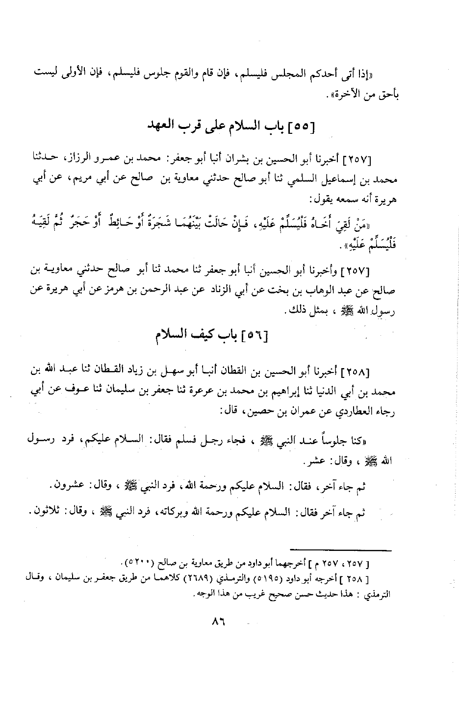 213 - أَخْبَرَنَا أَبُو الْحُسَيْنِ بْنُ بِشْرَانَ، أَنْبَأَنَا أَبُو جَعْفَرٍ مُحَمَّدُ بْنُ عَمْرٍو الرَّزَّازُ، حَدَّثَنَا مُحَمَّدُ بْنُ إِسْمَاعِيلَ السُّلَمِيُّ، حَدَّثَنَا أَبُو صَالِحٍ، حَدَّثَنِي مُعَاوِيَةُ بْنُ صَالِحٍ، عَنْ أَبِي مَرْيَمَ، عَنْ أَبِي هُرَيْرَةَ أَنَّهُ سَمِعَهُ يَقُولُ: «§مَنْ لَقِيَ أَخَاهُ فَلْيُسَلِّمْ عَلَيْهِ، فَإِنْ حَالَتْ بَيْنَهُمَا شَجَرَةٌ أَوْ حَائِطٌ أَوْ حَجَرٌ ثُمَّ لَقِيَهُ فَلْيُسَلِّمْ عَلَيْهِ» . وَأَخْبَرَنَا أَبُو الْحُسَيْنِ، أَنْبَأَنَا أَبُو جَعْفَرٍ، حَدَّثَنَا مُحَمَّدٌ، حَدَّثَنَا أَبُو صَالِحٍ، حَدَّثَنِي مُعَاوِيَةُ بْنُ صَالِحٍ، عَنْ عَبْدِ الْوَهَّابِ بْنِ بُخْتٍ، عَنْ أَبِي الزِّنَادِ، عَنْ عَبْدِ الرَّحْمَنِ بْنِ هُرْمُزَ، عَنْ أَبِي هُرَيْرَةَ عَنْ رَسُولِ اللَّهِ صَلَّى اللَّهُ عَلَيْهِ وَسَلَّمَ، بِمِثْلِ ذَلِكَ