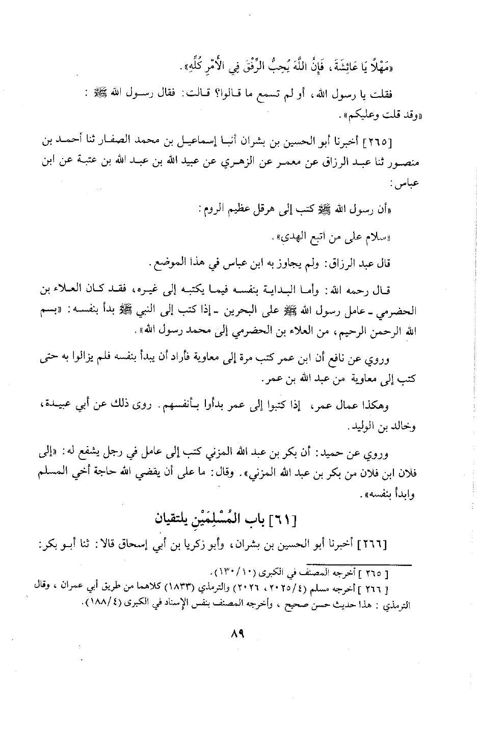 221 - أَخْبَرَنَا أَبُو الْحُسَيْنِ بْنُ بِشْرَانَ، أَنْبَأَنَا إِسْمَاعِيلُ بْنُ مُحَمَّدٍ الصَّفَّارُ، حَدَّثَنَا أَحْمَدُ بْنُ مَنْصُورٍ، حَدَّثَنَا عَبْدُ الرَّزَّاقِ، عَنْ مَعْمَرٍ، عَنِ الزُّهْرِيِّ، عَنْ عُبَيْدِ اللَّهِ بْنِ عَبْدِ اللَّهِ بْنِ عُتْبَةَ، عَنِ ابْنِ عَبَّاسٍ: أَنَّ رَسُولَ اللَّهِ صَلَّى اللَّهُ عَلَيْهِ وَسَلَّمَ كَتَبَ إِلَى هِرَقْلَ عَظِيمِ الرُّومِ §«سَلَامٌ عَلَى مَنِ اتَّبَعَ الْهُدَى» . قَالَ عَبْدُ الرَّزَّاقِ: وَلَمْ يُجَاوِزْ بِهِ ابْنُ عَبَّاسٍ فِي هَذَا الْمَوْضِعِ. قَالَ رَحِمَهُ اللَّهُ: وَأَمَّا الْبِدَايَةُ بِنَفْسِهِ فِيمَا يَكْتُبُهُ إِلَى غَيْرِهِ، فَقَدْ كَانَ الْعَلَاءُ بْنُ الْحَضْرَمِيِّ عَامِلُ رَسُولِ اللَّهِ صَلَّى اللَّهُ عَلَيْهِ وَسَلَّمَ عَلَى الْبَحْرَيْنِ إِذَا كَتَبَ إِلَى النَّبِيِّ صَلَّى اللَّهُ عَلَيْهِ وَسَلَّمَ بَدَأَ بِنَفْسِهِ: بِسْمِ اللَّهِ الرَّحْمَنِ الرَّحِيمِ، مِنَ الْعَلَاءِ بْنِ الْحَضْرَمِيِّ إِلَى مُحَمَّدٍ رَسُولِ اللَّهِ، وَهَكَذَا عُمَّالُ عُمَرَ، إِذَا كَتَبُوا إِلَى عُمَرَ بَدَءُوا بِأَنْفُسِهِمْ، رُوِيَ ذَلِكَ عَنْ أَبِي عُبَيْدَةَ، وَخَالِدِ بْنِ الْوَلِيدِ. وَرُوِيَ عَنْ حُمَيْدٍ: أَنَّ بَكْرَ بْنَ عَبْدِ اللَّهِ الْمُزَنِيَّ كَتَبَ إِلَى عَامِلٍ فِي رَجُلٍ يَشْفَعُ لَهُ، إِلَى فُلَانِ بْنِ فُلَانٍ مِنْ بَكْرِ بْنِ عَبْدِ اللَّهِ الْمُزَنِيِّ، وَقَالَ: مَا عَلَيَّ أَنْ يَقْضِيَ اللَّهُ حَاجَةَ أَخِي الْمُسْلِمِ وَأَبْدَأُ بِنَفْسِي
