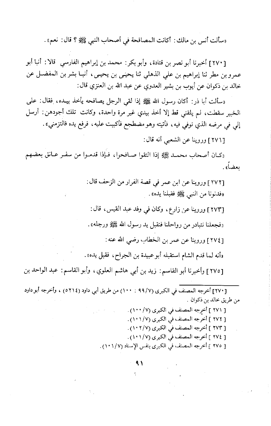 226 - أَخْبَرَنَا أَبُو نَصْرِ بْنُ قَتَادَةَ، وَأَبُو بَكْرٍ مُحَمَّدُ بْنُ إِبْرَاهِيمَ الْفَارِسِيُّ قَالَا: أَنْبَأَنَا أَبُو عَمْرِو بْنُ مَطَرٍ، حَدَّثَنَا إِبْرَاهِيمُ بْنُ عَلِيٍّ الذُّهْلِيُّ، حَدَّثَنَا يَحْيَى بْنُ يَحْيَى، أَنْبَأَنَا بِشْرُ بْنُ الْمُفَضَّلِ، عَنْ خَالِدِ بْنِ ذَكْوَانَ، عَنْ أَيُّوبَ بْنِ بُشَيْرٍ الْعَدَوِيِّ، عَنْ عَبْدِ اللَّهِ بْنِ الْعَنَزِيِّ قَالَ: سَأَلْتُ أَبَا ذَرٍّ أَكَانَ رَسُولُ اللَّهِ صَلَّى اللَّهُ عَلَيْهِ وَسَلَّمَ §إِذَا لَقِيَ الرَّجُلَ يُصَافِحُهُ يَأْخُذُ بِيَدِهِ، فَقَالَ: عَلَى الْخَيْرِ سَقَطْتَ، لَمْ يَلْقَنِي قَطُّ إِلَّا أَخَذَ بِيَدِي غَيْرَ مَرَّةٍ وَاحِدَةٍ، وَكَانَتْ تِلْكَ أَجْوَدَهُنَّ، أَرْسَلَ إِلَيَّ فِي مَرَضِهِ الَّذِي تُوُفِّيَ فِيهِ، فَأَتَيْتُهُ وَهُوَ مُضْطَجِعٌ فَأَكْبَبْتُ عَلَيْهِ، فَرَفَعَ يَدَهُ فَالْتَزَمَنِي. وَرُوِّينَا عَنِ الشَّعْبِيِّ أَنَّهُ قَالَ: «كَانَ أَصْحَابُ مُحَمَّدٍ صَلَّى اللَّهُ عَلَيْهِ وَسَلَّمَ إِذَا الْتَقُوا صَافَحُوا، فَإِذَا قَدِمُوا مِنْ سَفَرٍ عَانَقَ بَعْضُهُمْ بَعْضًا» . وَرُوِّينَا عَنِ ابْنِ عُمَرَ فِي قِصَّةِ الْفِرَارِ مِنَ الزَّحْفِ قَالَ: «فَدَنَوْنَا مِنَ النَّبِيِّ صَلَّى اللَّهُ عَلَيْهِ وَسَلَّمَ فَقَبَّلْنَا يَدَهُ» . وَرُوِّينَا عَنْ زَارِعٍ وَكَانَ فِي وَفْدِ عَبْدِ الْقَيْسِ قَالَ: «فَجَعَلْنَا نَتَبَادَرُ مِنْ رَوَاحِلِنَا فَنُقَبِّلُ يَدَ رَسُولِ اللَّهِ صَلَّى اللَّهُ عَلَيْهِ وَسَلَّمَ وَرِجْلَهُ» وَرُوِّينَا عَنْ عُمَرَ بْنِ الْخَطَّابِ رَضِيَ اللَّهُ عَنْهُ أَنَّهُ لَمَّا قَدِمَ الشَّامَ اسْتَقْبَلَهُ أَبُو عُبَيْدَةَ بْنُ الْجَرَّاحِ فَقَبَّلَ يَدَهُ "
