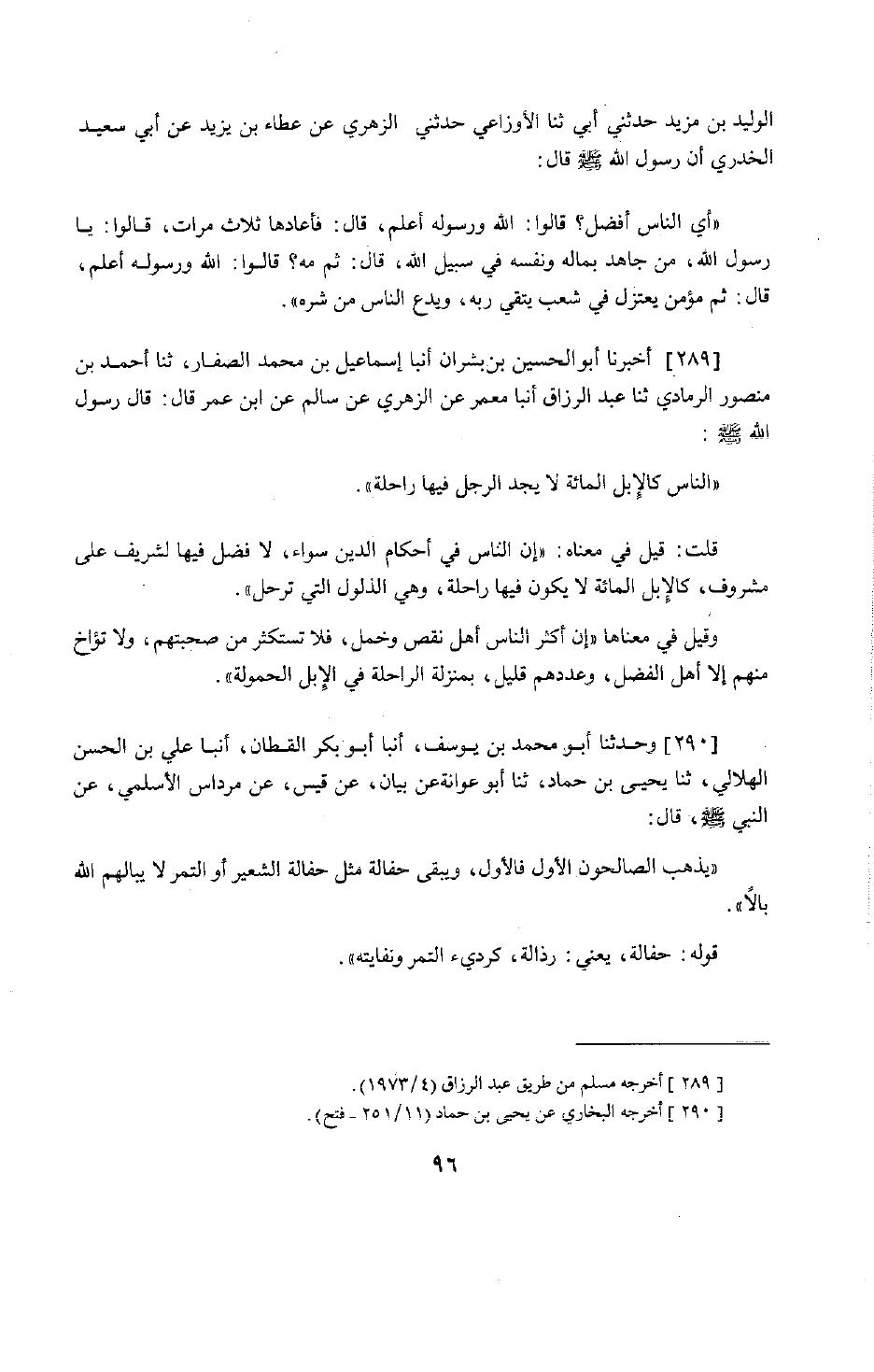 238 - أَخْبَرَنَا أَبُو الْحُسَيْنِ بْنُ بِشْرَانَ، أَنْبَأَنَا إِسْمَاعِيلُ بْنُ مُحَمَّدٍ الصَّفَّارُ، حَدَّثَنَا أَحْمَدُ بْنُ مَنْصُورٍ الرَّمَادِيُّ، حَدَّثَنَا عَبْدُ الرَّزَّاقِ، أَنْبَأَنَا مَعْمَرٌ، عَنِ الزُّهْرِيِّ، عَنْ سَالِمٍ، عَنِ ابْنِ عُمَرَ قَالَ: قَالَ رَسُولُ اللَّهِ صَلَّى اللَّهُ عَلَيْهِ وَسَلَّمَ: §«النَّاسُ كَالْإِبِلِ الْمِائَةِ لَا يَجِدُ الرَّجُلُ فِيهَا رَاحِلَةً» قُلْتُ: قِيلَ فِي مَعْنَاهُ: إِنَّ النَّاسَ فِي أَحْكَامِ الدِّينِ سَوَاءٌ، لَا فَضْلَ فِيهَا لِشَرِيفٍ عَلَى مَشْرُوفٍ، كَالْإِبِلِ الْمِائَةِ لَا يَكُونُ فِيهَا رَاحِلَةٌ، وَهِيَ الدَّلُولُ الَّتِي تَرْحَلُ، وَقِيلَ فِي مَعْنَاهُ: إِنَّ أَكْثَرَ النَّاسِ أَهْلُ نَقْصٍ وَحَمْلٍ، فَلَا تَسْتَكْثِرْ مِنْ صُحْبَتِهِمْ، وَلَا تَوَخَّ مِنْهُمْ إِلَّا أَهْلَ الْفَضْلِ، وَعَدَدُهُمْ قَلِيلٌ، بِمَنْزِلَةِ الرَّاحِلَةِ فِي الْإِبِلِ الْحَمُولَةِ