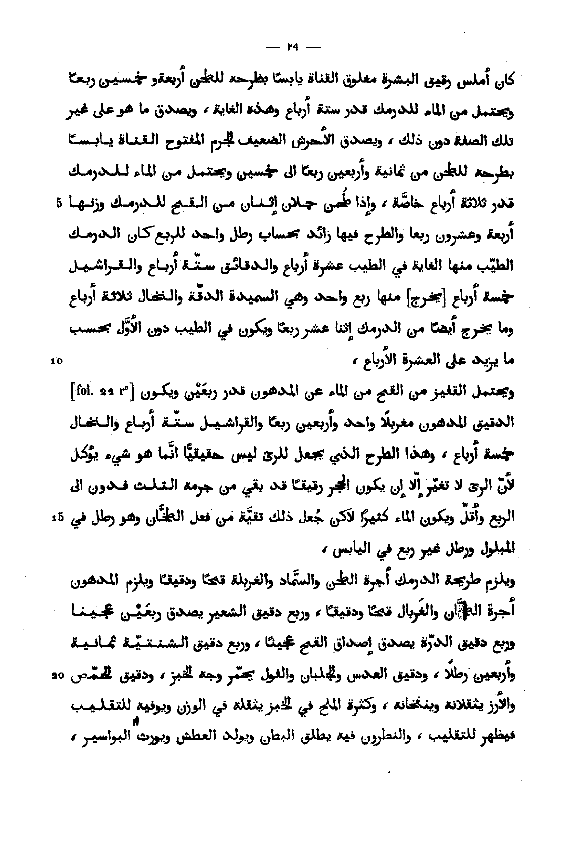 كان أملس رقيق البشرة مغلوق القناة يابسا بطرحه للطحن أربعة وخمسين ربعا ويحتمل من الماء للدرمك قدر ستة أرباع وهذه الغاية، ويصدق ما هو على غير تلك الصفة دون ذلك، ويصدق الأحرش الضعيف الجرم المفتوح القناة يابسا بطرحه للطحن من ثمانية وأربعين ربعا إلى خمسين ويحتمل من الماء للدرمك قدر ثلاثة أرباع خاصة، وإذا طحن حملان إثنان من القمح للدرمك وزنها أربعة وعشرون ربعا والطرح فيها زائد بحساب رطل واحد للربع كان الدرمك الطيب منها الغاية في الطيب عشرة أرباع والدقائق ستة أرباع والقراشيل خمسة أرباع يخرج منها ربع واحد وهي السميدة الدقة والنخال ثلاثة أرباع وما يخرج أيضا من الدرمك إثنا عشر ربعا ويكون في الطيب دون الأول بحسب ما يزيد على العشرة الأرباع.