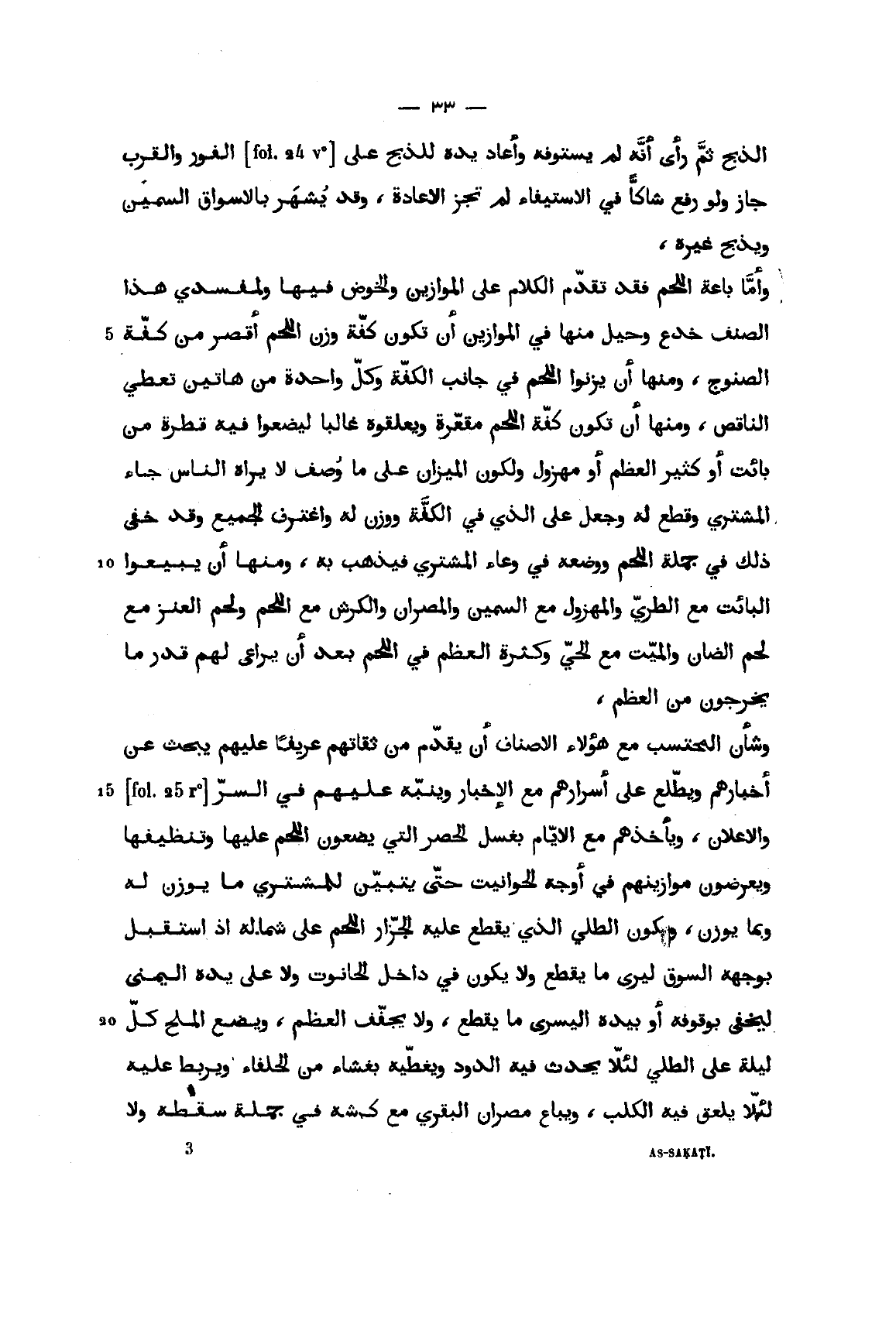 وشأن المحتسب مع هؤلاء الأصناف أن يقدم من ثقاتهم عريفا عليهم يبحث عن أخبارهم ويطلع على أسرارهم مع الإخبار وينبه عليهم في السر والإعلان، ويأخذهم مع الأيام بغسل الحصر التي يضعون اللحم عليها وتنظيفها ويعرضون موازينهم في أوجه الحوانيت حتى يتبين للمشتري ما يوزن له وبما يوزن، ويكون الطلي الذي يقطع عليه الجزار اللحم على شماله إذ استقبل بوجه السوق ليري ما يقطع ولا يكون في داخل الحانوت ولا على يده اليمنى ليخفي بوقوفه أو بيده اليسري ما يقطع، ولا يجفف العظم، ويضع الملح كل ليلة على الطلي لئلا يحدث فيه الدود ويغطيه بغشاء من الحلفاء ويربط عليه لئلا يلعق فيه الكلب، ويباع مصران البقري مع كشه في جملة سقطه ولا