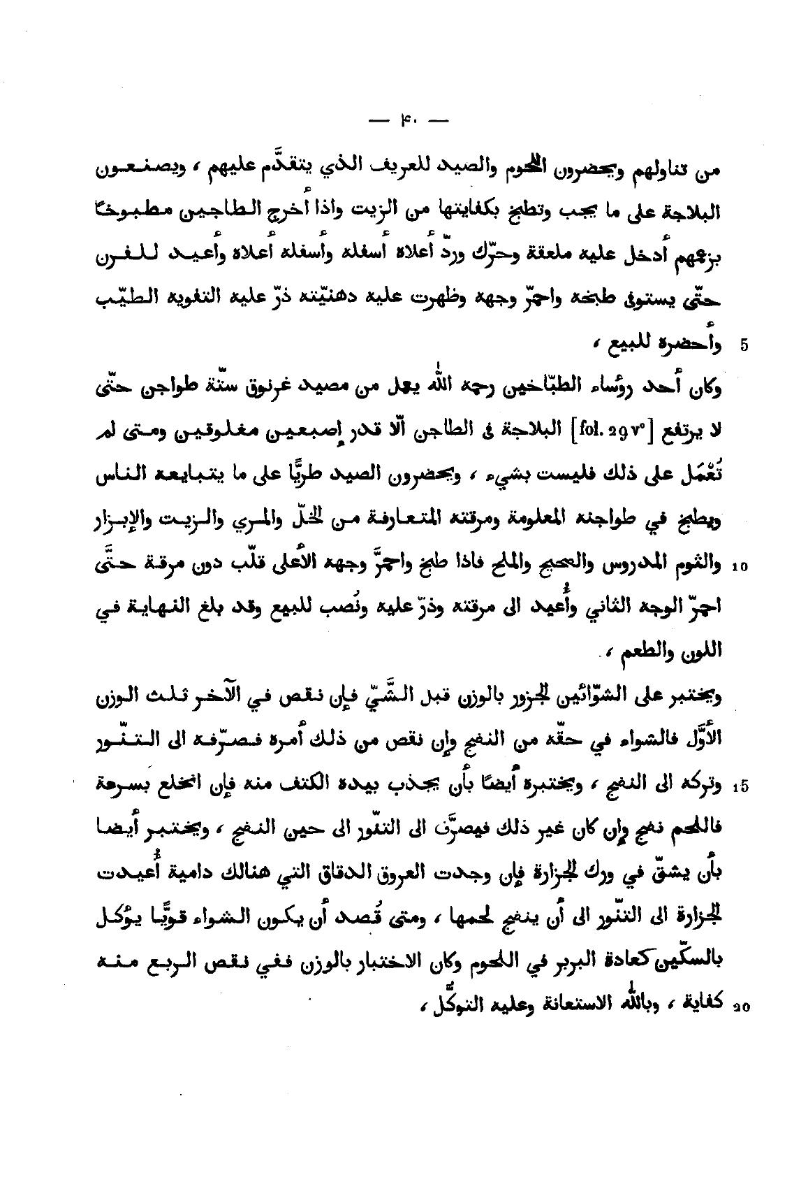 من تناولهم ويحضرون اللحوم والصيد للعريف الذي يتقدم عليهم، ويصنعون البلاجة على ما يجب وتطبخ بكفايتها من الزيت وإذا أخرج الطاجين مطبوخا بزعمهم أدخل عليه ملعقة وحرك ورد أعلاه أسفله وأسفله أعلاه وأعيد للفرن حتى يستوفي طبخه وأحمر وجهه وظهرت عليه دهنيته ذر عليه التفويه الطيب وأحضره للبيع.
