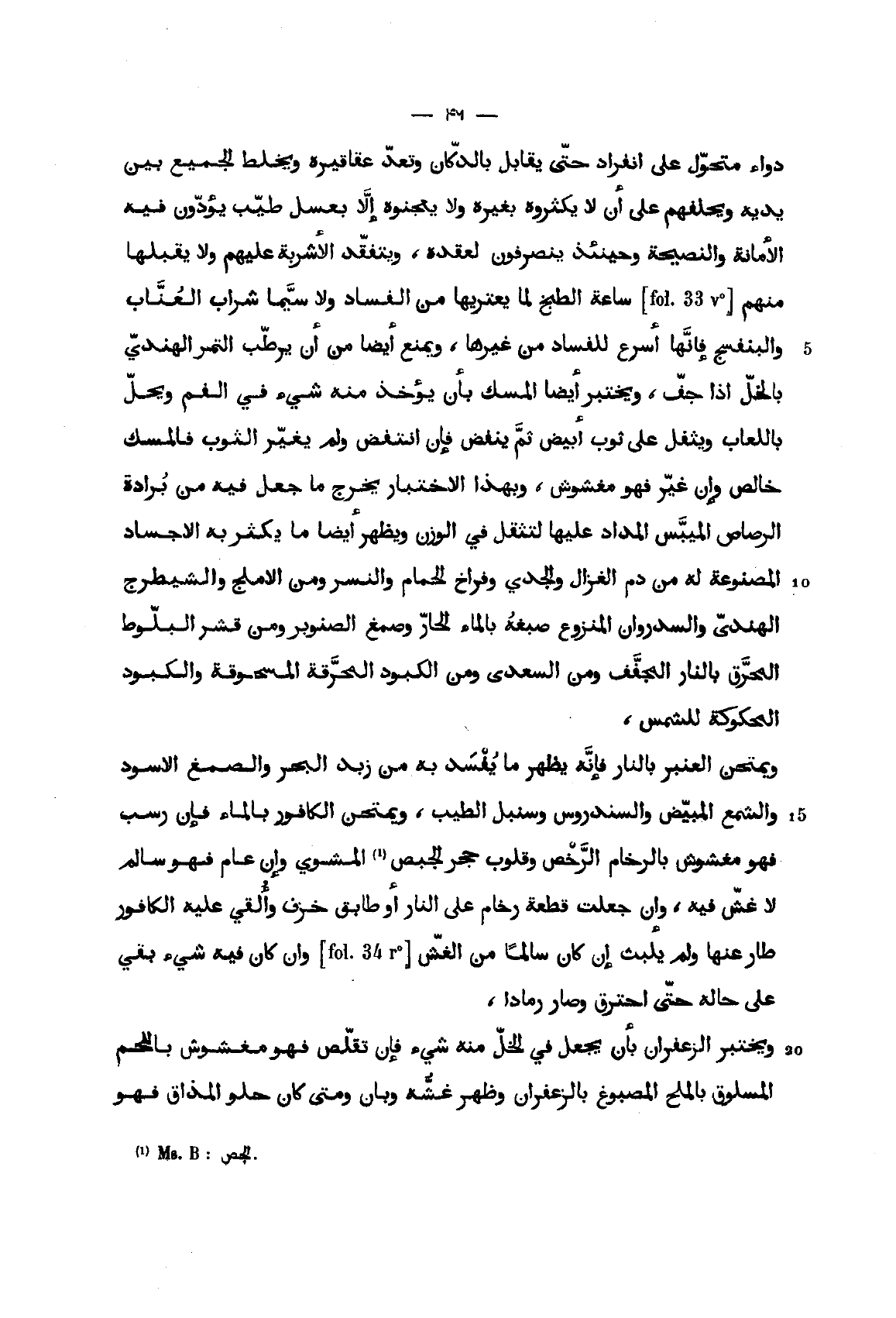 دواء متحوّل على انفراد حتى يقابل بالدكان وتعد عقاقيره ويخلط الجميع بين يديه ويحلفهم على أن لا يكثروه بغيره ولا يعجنوه إلا بعسل طيب يؤدون فيه الأمانة والنصيحة وحينئذ ينصرفون لعقده، ويتفقد الأشربة عليهم ولا يقبلها منهم ساعة الطبخ لما يعتريها من الفساد ولا سيما شراب العناب والبنفسج فإنها أسرع للفساد من غيرها، ويمنع أيضا من أن يرطب التمر الهندي بالخل إذا جف، ويختبر أيضا المسك بأن يؤخذ منه شيء في الفم ويحل باللعاب ويثقل على ثوب أبيض ثم ينفض فإن انتفض ولم يغير الثوب فالمسك خالص وإن غير فهو مغشوش، وبهذا الاختبار يخرج ما جعل فيه من برادة الرصاص وإن غير فهو مغشوش، وبهذا الاختبار يخرج ما يجعل فيه من برادة الرصاص الميبس المداد عليها لتثقل في الوزن ويظهر أيضا ما يكثر به الأجساد المصنوعة له من دم الغزال والجدي وفراخ الحمام والنسر ومن الأملج والشيطرج الهندي والسدروان المنزوع صبغه بالماء الحار وصمغ الصنوبر ومن قشر البلوط المحرق بالنار المجفف ومن السعدي ومن الكبود المحرقة المسحوقة والكبود الممحكوكة للشمس.