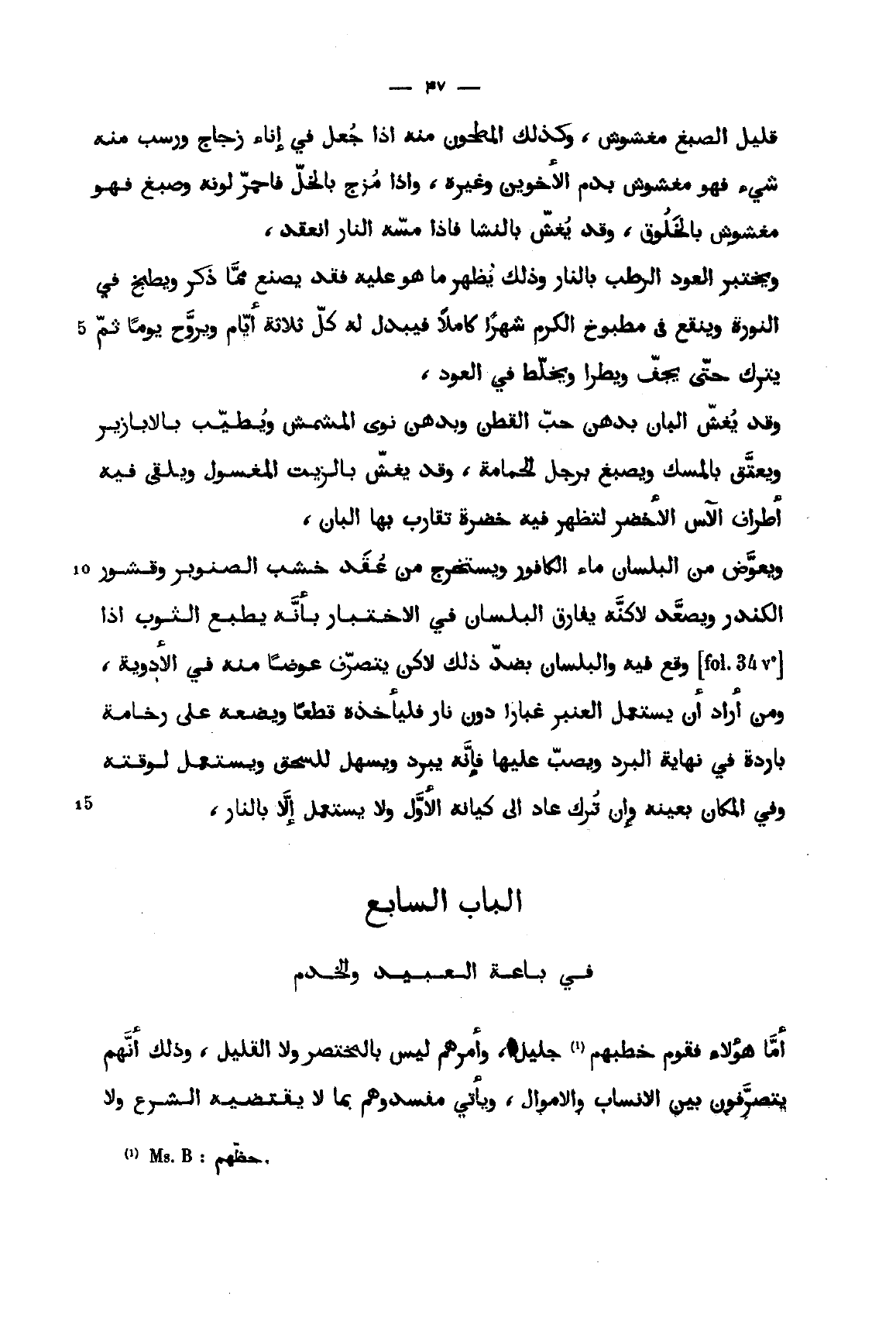 ويعوض من البلسان ماء الكافور ويستخرج من عقد خشب الصنوبر وقشور الكندر ويصعد لكنه يفارق البلسان في الاختبار بأنه يطبع الثوب إذا وقع فيه والبلسان بضد ذلك لكن يتصرف عوضا منه في الأدوية، ومن أراد أن يستعمل العنبر غبارا دون نار فليأخذه قطعا ويضعه على رخامة باردة في نهاية البرد ويصب عليها فإنه يبرد ويسهل للسحق ويستعمل لوقته وفي المكان بعينه وإن ترك عاد إلى كيانه الأول ولا يستعمل إلا بالنار.