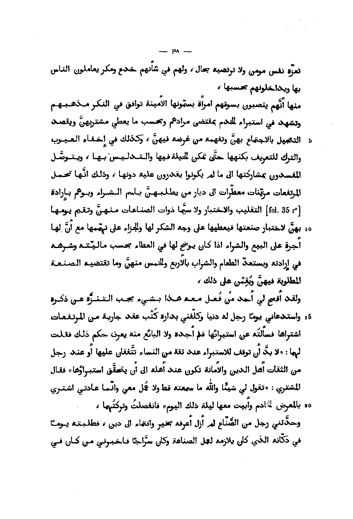 ولقد أفصح لي أحد من فعل معه هذا بشيء يجب التنزه عن ذكره واستدعاني يوما رجل له دنيا وكلفني بداره كتب عقد جارية من المرتفعات اشتراها فسألته عن استبرائها فلم أجده ولا البائع منه يعرف حكم ذلك فقلت لهما لابد أن توقف للاستبراء عند ثقة من النساء تتفقان عليها أو عند رجل من الثقات أهل الدين والأمانة تكون عند أهله إلى أن يتحقق استبراؤها فقال المشتري تقول لي شيئا والله ما سمعته قط ولا عمل معي وإنما عادتي اشتري بالمعرض الخادم وأبيت معها ليلة ذلك اليوم فانفصلت وتركتهما.