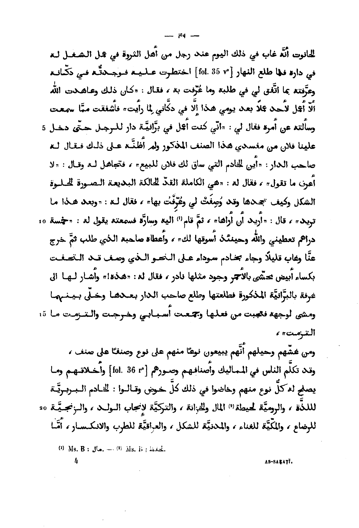 الحانوت أنه غاب في ذلك اليوم عند رجل من أهل الثروة في عمل الشغل له في داره فلما طلع النهار اختطرت عليه فوجدته في دكانه وعرفته بما اتفق لي في طلبه وما عرفت به، فقال كان ذلك وعاهدت الله ألا أعمل لأحد عملا بعد يومي هذا إلا في دكاني لما رأيت، فأشفقت مما سمعت وسألته عن أمره فقال لي: إني كنت أعمل في برانية دار للرجل حتى دخل علينا فلان من مفسدي هذا الصنف المذكور ولم أظنه على ذلك فقال له صاحب الدار: أين الخادم التي ساق لك فلان للبيع، فتجاهل له وقال لا أعرف ما تقول، فقال له: هي الكاملة القد الحالكة البديعة الصورة الحلوة الشكل وكيف تجحدها وقد وصفت لي وعرفت بها، فقال له: وبعد هذا ما تريد قال أريد أن أراهان ثم قام إليه وساره فسمعته يقول له: خمسة دراهم تعطيني والله وحينئذ أسوقها لك، وأعطاه صاحبه الذي طلب ثم خرج عنا وغاب قليلا وجاء بخادم سوداء على النحو الذي وصف قد التحفت بكساء أبيض محشي بالأحمر وجود مثلها نادر، فقال له هذه وأشار لها إلى غرفة بالبرانية المذكورة فطلعتها وطلع صاحب الدار بعدها وخلي بينهما ومشي لوجهه فعجبت من فعلها وجمعت أسبابي وخرجت والتزمت ما التزمت.