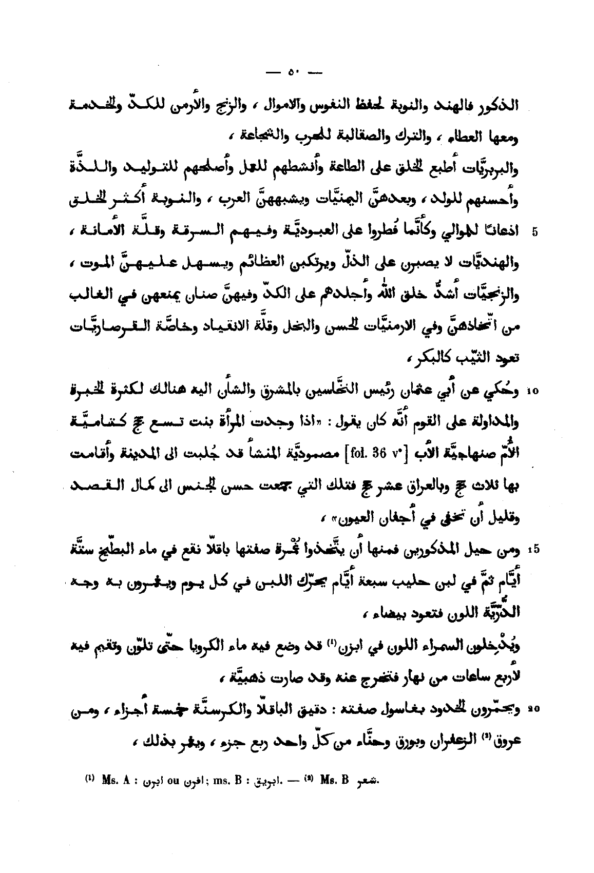 والبربريات أطبع الخلق على الطاعة وأنشطهم للعمل وأصلحهم للتوليد واللذة وأحسنهم للولد، وبعدهن اليمنيات ويشبههن العرب، والنوبة أكثر الخلق إذعانا للموالي وكأنما فطروا على العبودية وفيهم السرقة وقلة الأمانة والهنديات لا يصبرن على الذل ويرتكبن العظائم ويسهل عليهن الموت، والزنجيات أشد خلق الله وأجلدهم على الكد وفيهن صنان يمنعهن في الغالب من اتخاذهن وفي الأرمنيات الحسن والبخل وقلة الانقياد وخاصة القرصاريات تعود الثيب كالبكر.