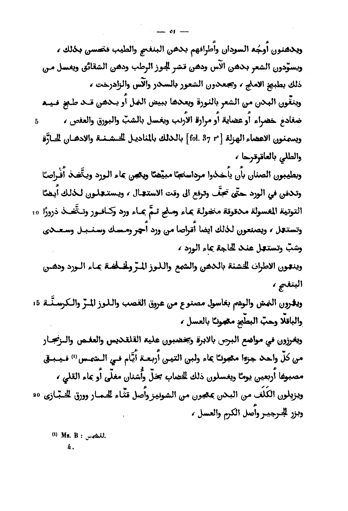 وينعمون الأطراف الخشنة بالدهن والشمع واللوز المر ولخلخة بماء الورد ودهن البنفسج، ويغمرون النمش والوشم بغاسول مصنوع من عروق القصب واللوز المر والكرسنة والباقلا وحب البطيخ معجونا بالعسل.