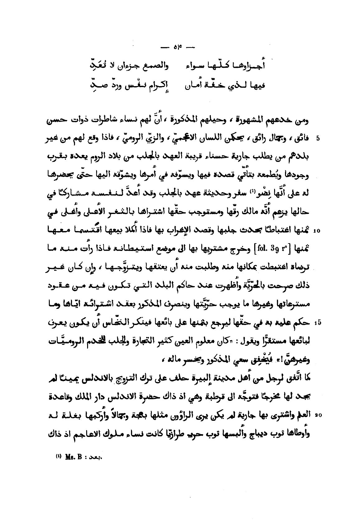 كما اتفق لرجل من أهل مدينة البيرة حلف على ترك التزويج بالأندلس يمينا لم يجد لها مخرجا فتوجه إلى قرطبة وهي إذ ذاك حضرة الأندلس دار الملك وقاعدة العلم واشترى بها جارية لم يكن يرى الراؤون مثلها بعجة وجمالا وأركبها بغلة له وأوطاها ثوب ديباج وألبسها ثوب حري طرازيا كانت نساء ملوك الأعاجم إذ ذاك
