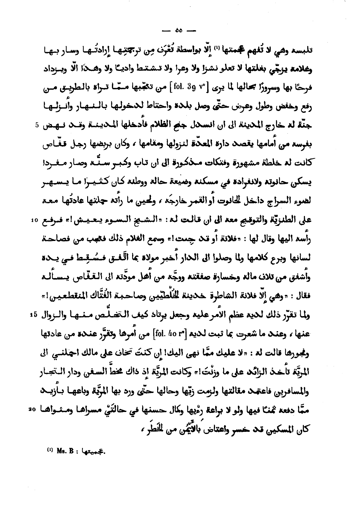 تلبسه وهي لا تفهم عجمتها إلا بواسطة تعرف من ترجمتها إرادتها وسار بها وغلامه يزجي بغلتها لا تعلو نشزا ولا وعرا ولا تشتط واديا ولا وهدا إلا ويزداد فرحا بها وسرورا بحالها لما يرى من تعجبها مما تراه بالطريق من رفع وخفض وطول وعرض حتى وصل بلده واحتاط لدخولها بالنهار وأنزلها جنة له خارج المدينة إلى أن انسدل جنح الظلام فأدخلها المدينة وقد نهض بفرسه من أمامها يقصد داره المعدة لنزولها ومقامها، وكان بربضها رجل قفاص كانت له خلطة مشهورة وفتكات مذكورة إلى أن تاب وكبر سنه وصار مفردا يسكن حانوته ولانفراده في مسكنه وضيعة حاله ووطنه كان كثيرا ما يسهر لضوء السراج داخل الحانوت أو القمر خارجه، ولحين ما رأته حملتها عادتها معه على الطنزية والتوقيح معه إلى أن قالت له: الشيخ السوء يعيش فرفع رأسه إليها وقال لها فلانة أوقد جئت، وسمع الغلام ذلك فعجب من فصاحة لسانها وبرع كلامها ولما وصلوا إلى الدار أخبر مولاة بما اتفق فسقط في يده وأشفق من تلاف ماله وخسارة صفقته ووجه من أهل مودته إلى القفاص يسأله فقال: وهي إلا فلانة الشاطرة خدينة الخلطيين وصاحبة الفتاك المنقطعين، ولما تقرر ذلك لديه عظم الأمر عليه وجعل يرتاد كيف التخلص منها والزوال عنها وعندما شعرت بما ثبت لديه من أمرها وتقرر عنده من عادتها وفجورها قالت له: لا عليك مما نهى إليك إن كنت تخاف على مالك احملني إلى المرية تأخذ الزائد على ما وزنت، وكانت المرية إذ ذاك مخط السفن ودار التجار والمسافرين فاعتمد مقالتها ولزمت زيها وحالها حتى ورد بها المرية وباعها بأزيد مما دفعه ثمنا فيها ولولا براعة رئيها وكمال حسنها في حالتي مسراها ومثواها كان المسكين قد خسر واعتاض بالأيمن من الخطر.