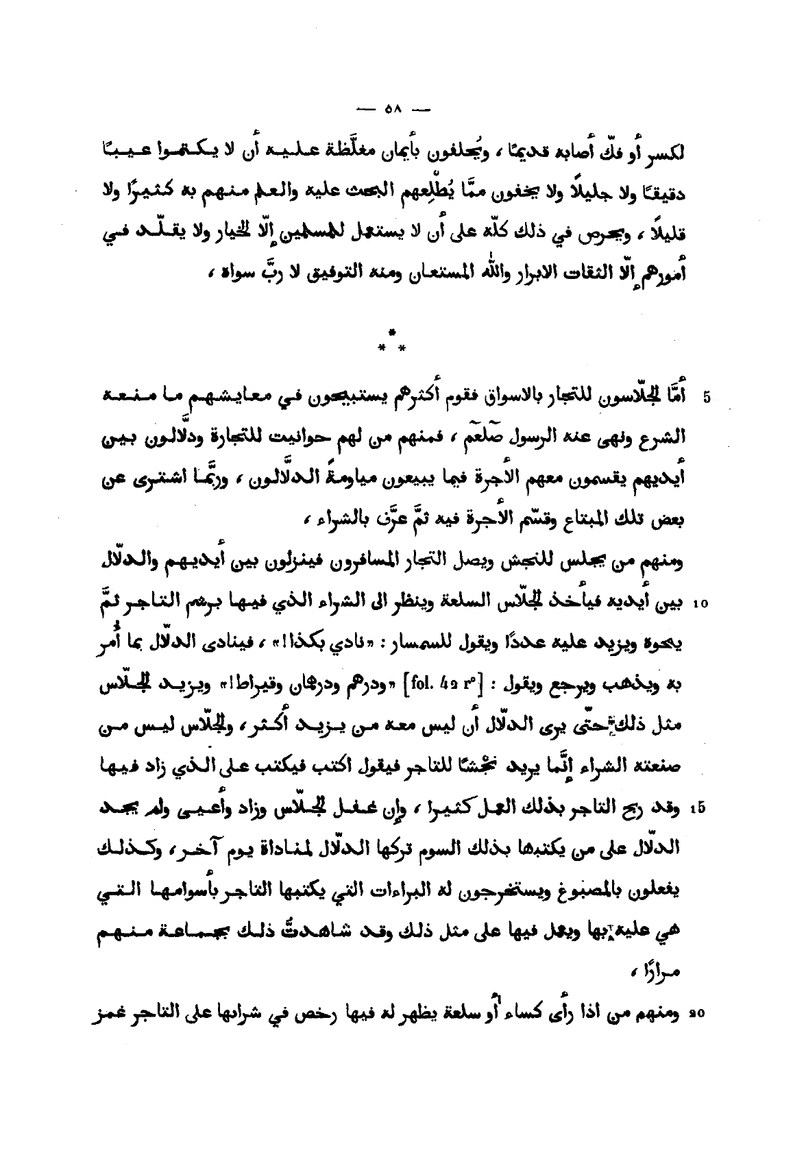 أما الجلاسون للتجار بالأسواق فقوم أكثرهم يستبيحون في معايشهم ما منعه الشرع ونهى عنه الرسول صلى الله عليه وسلم، فمنهم من لهم حوانيت للتجارة ودلالون بين أيديهم يقسمون معهم الأجرة فيما يبيعون مياومة الدلالون، وربما اشترى عن بعض تلك المبتاع وقسم الأجرة فيه ثم عرف بالشراء.