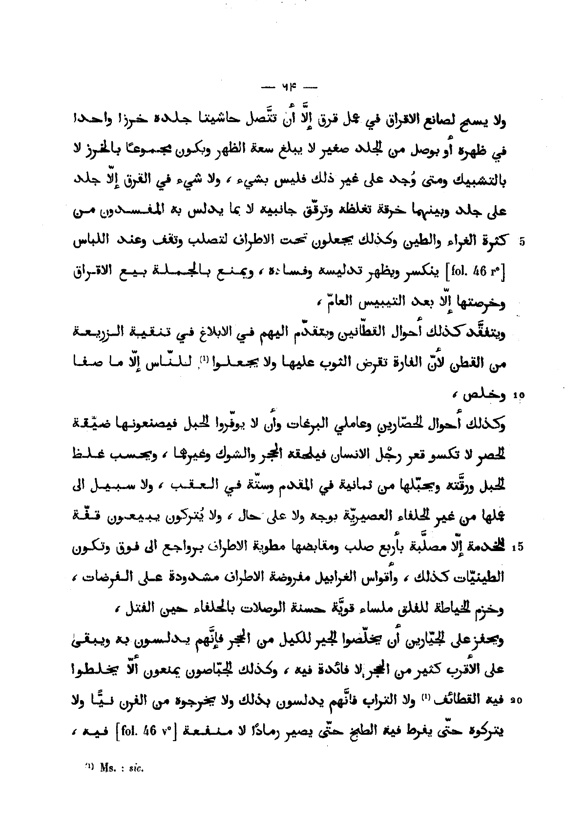 ولا يسمح لصانع الأقراق في عمل قرق إلا أن تنصل حاشيتا جلده خرزا واحدا في ظهره أو بوصل من الجلد صغير لا يبلغ سعة الظهر ويكون مجموعا بالخرز لا بالتشبيك ومتى وجد على غير ذلك فليس بشيء، ولا شيء في القرق إلا جلد على جلد وبينها خرقة تغلظه وترقق جانبيه لا بما يدلس به المفسدون من كثرة الغراء والطين وكذلك يجعلون تحت الأطراف لتصلب وتقف وعند اللباس ينكسر ويظهر تدليسه وفساده، ويمنع بالجملة بيع الأقراق وخرصتها إلا بعد التيبيس العام.