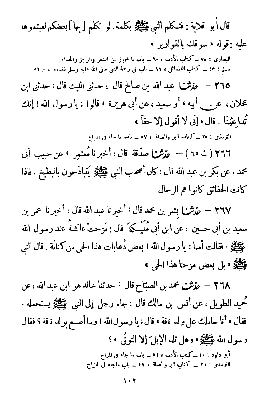 268 - حَدَّثَنَا مُحَمَّدُ بْنُ الصَّبَّاحِ حَدَّثَنَا خَالِدٌ هُوَ ابْنُ عَبْدِ اللَّهِ، عَنْ حُمَيْدٍ الطَّوِيلِ، عَنْ أَنَسِ بْنِ مَالِكٍ قَالَ: جَاءَ رَجُلٌ إِلَى النَّبِيِّ صَلَّى اللهُ عَلَيْهِ وَسَلَّمَ يَسْتَحْمِلُهُ، فَقَالَ: «§أَنَا حَامِلُكَ عَلَى وَلَدِ نَاقَةٍ» ، قَالَ: يَا رَسُولَ اللَّهِ، وَمَا أَصْنَعُ بِوَلَدِ نَاقَةٍ؟ فَقَالَ رَسُولُ اللَّهِ صَلَّى اللهُ عَلَيْهِ وَسَلَّمَ: «وَهَلْ تَلِدُ الْإِبِلَ إِلَّا النُّوقُ» Kصحيح