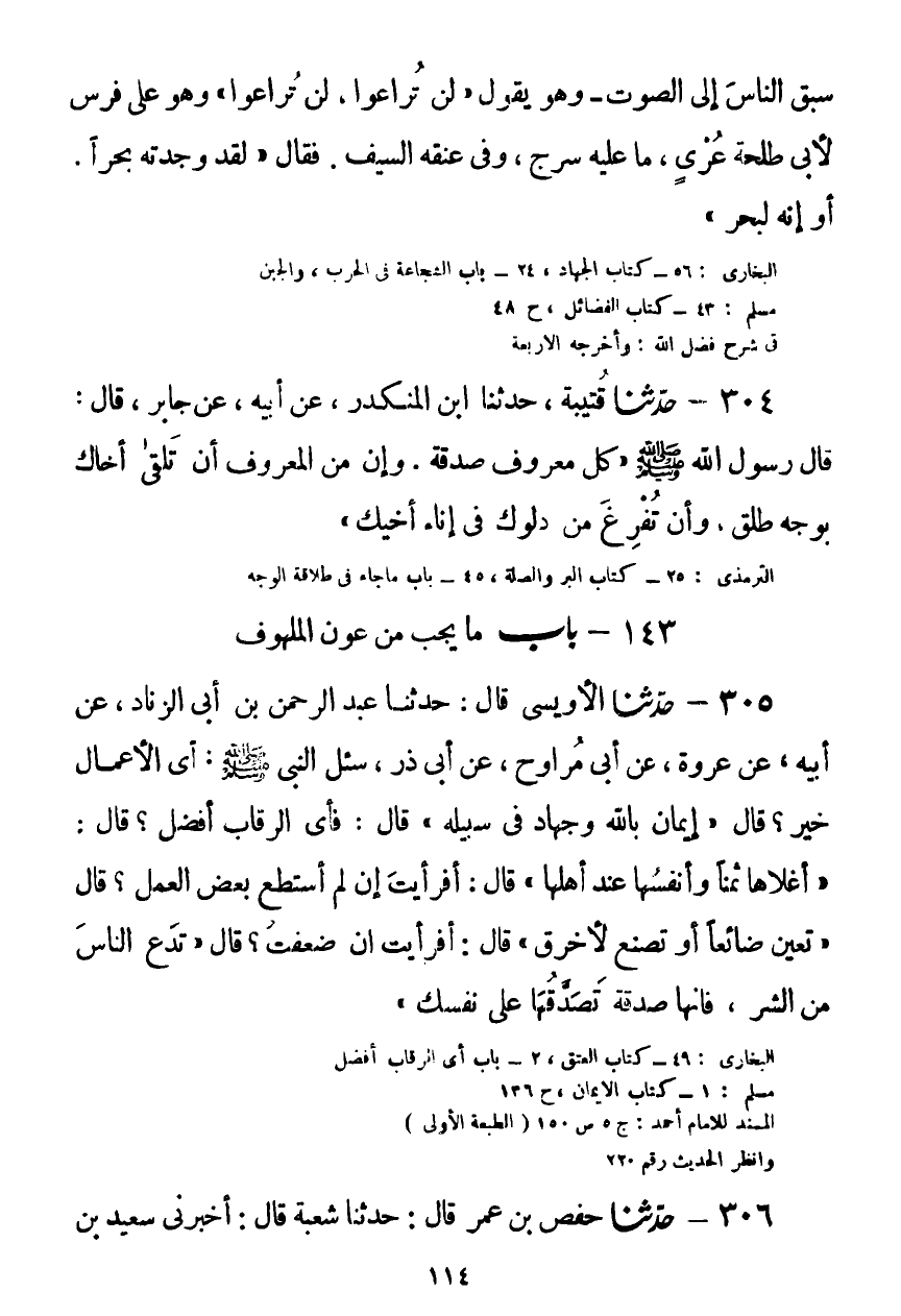 304 - حَدَّثَنَا قُتَيْبَةُ، حَدَّثَنَا ابْنُ الْمُنْكَدِرِ، عَنْ أَبِيهِ، عَنْ جَابِرٍ قَالَ: قَالَ رَسُولُ اللَّهِ صَلَّى اللهُ عَلَيْهِ وَسَلَّمَ: «§كُلُّ مَعْرُوفٍ صَدَقَةٌ، إِنَّ مِنَ الْمَعْرُوفِ أَنْ تَلْقَى أَخَاكَ بِوَجْهٍ طَلْقٍ، وَأَنْ تُفْرِغَ مِنْ دَلْوِكَ فِي إِنَاءِ أَخِيكَ» Kحسن