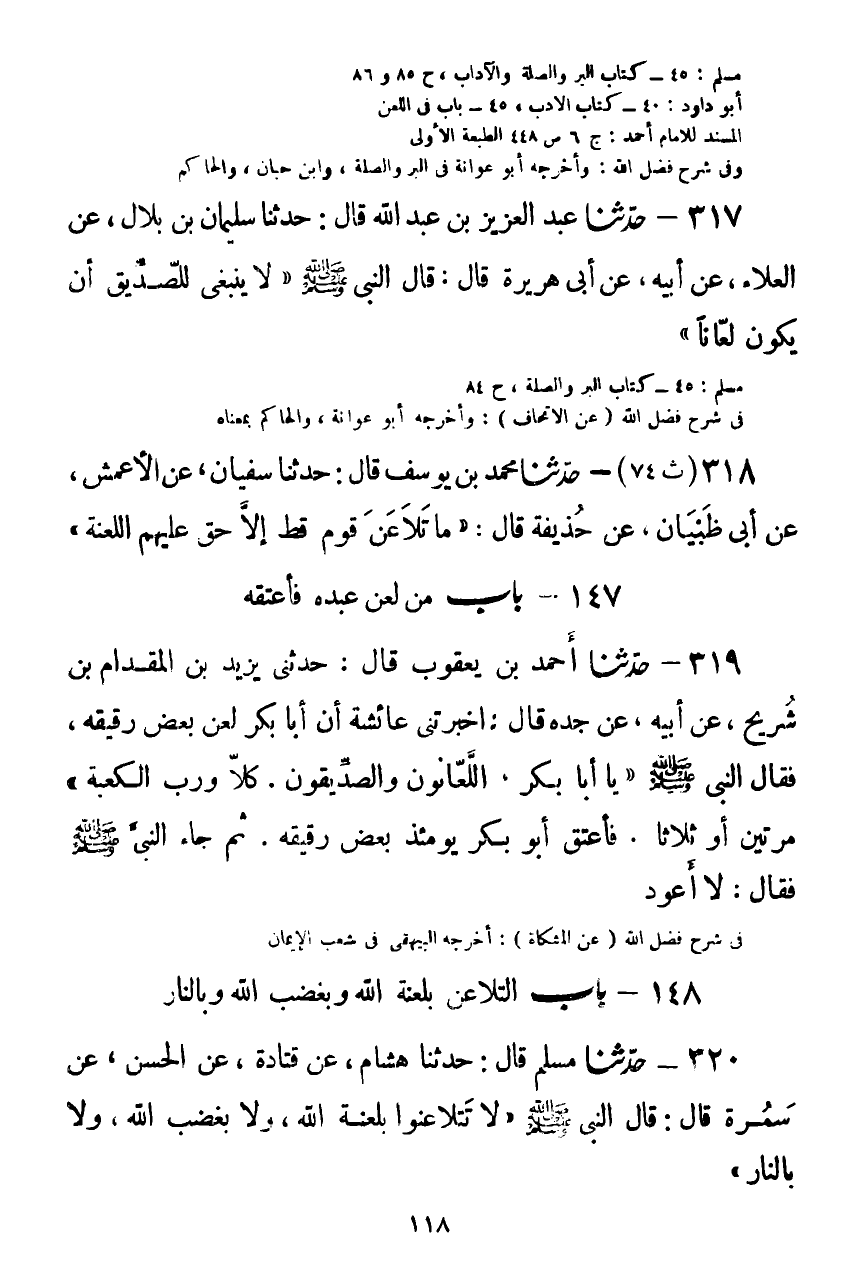 317 - حَدَّثَنَا عَبْدُ الْعَزِيزِ بْنُ عَبْدِ اللَّهِ قَالَ: حَدَّثَنَا سُلَيْمَانُ بْنُ بِلَالٍ، عَنِ الْعَلَاءِ، عَنْ أَبِيهِ، عَنْ أَبِي هُرَيْرَةَ قَالَ: قَالَ النَّبِيُّ صَلَّى اللهُ عَلَيْهِ وَسَلَّمَ: «§لَا يَنْبَغِي لِلصِّدِّيقِ أَنْ يَكُونَ لَعَّانًا» Kصحيح