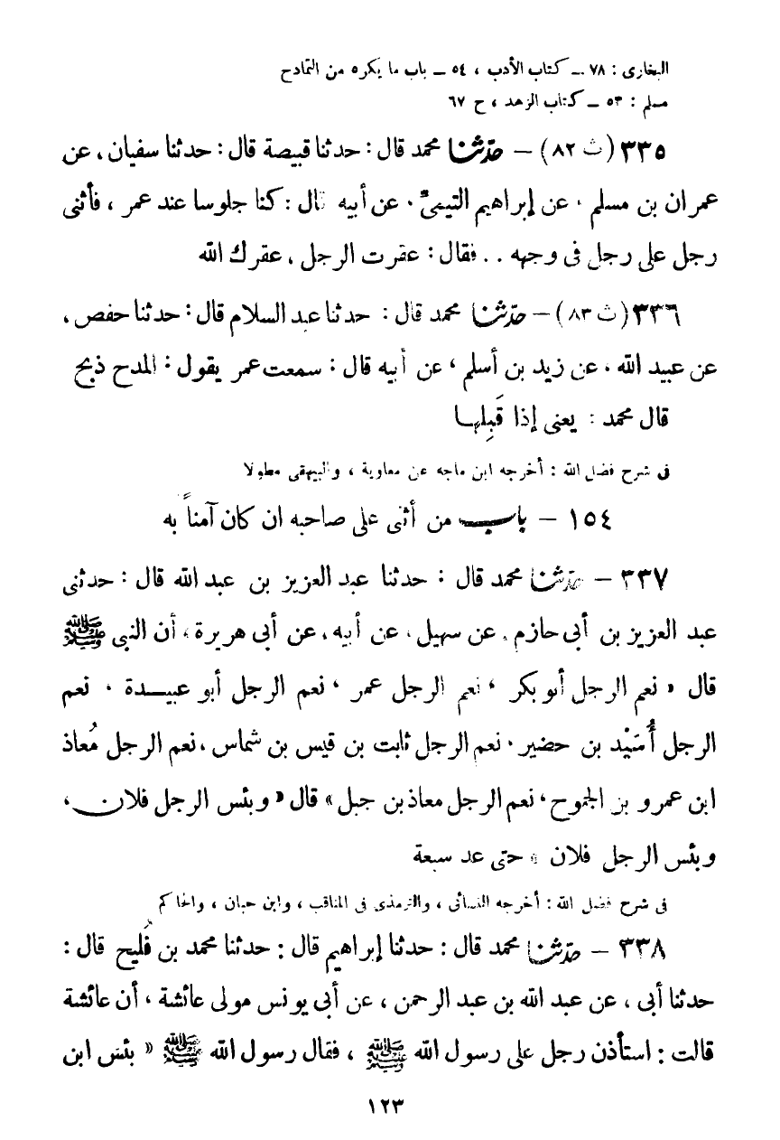 336 - حَدَّثَنَا عَبْدُ السَّلَامِ قَالَ: حَدَّثَنَا حَفْصٌ، عَنْ عُبَيْدِ اللَّهِ، عَنْ زَيْدِ بْنِ أَسْلَمَ، عَنْ أَبِيهِ قَالَ: سَمِعْتُ عُمَرَ يَقُولُ: «§الْمَدْحُ ذَبْحٌ» ، قَالَ مُحَمَّدٌ: يَعْنِي إِذَا قَبِلَهَا.Kصحيح