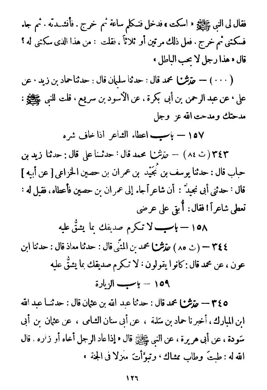 343 - حَدَّثَنَا عَلِيٌّ قَالَ: حَدَّثَنَا زَيْدُ بْنُ حُبَابٍ قَالَ: حَدَّثَنَا يُوسُفُ بْنُ عَبْدِ اللَّهِ بْنِ نُجَيْدِ بْنِ عِمْرَانَ بْنِ حُصَيْنٍ الْخُزَاعِيُّ قَالَ: حَدَّثَنِي أَبِي نُجَيْدٌ، أَنَّ شَاعِرًا جَاءَ إِلَى عِمْرَانَ بْنِ حُصَيْنٍ فَأَعْطَاهُ، فَقِيلَ لَهُ: §تُعْطِي شَاعِرًا؟ فَقَالَ: أُبْقِي عَلَى عِرْضِيKضعيف