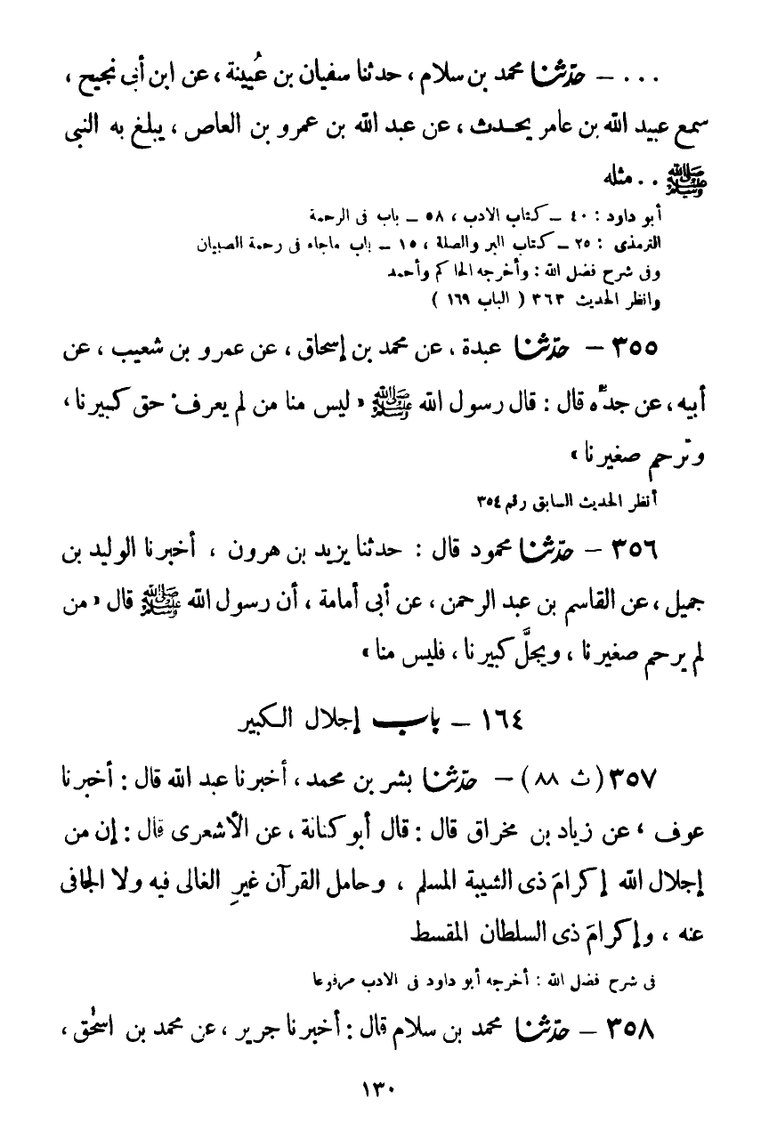 358 - حَدَّثَنَا مُحَمَّدُ بْنُ سَلَّامٍ قَالَ: أَخْبَرَنَا جَرِيرٌ، عَنْ مُحَمَّدِ بْنِ إِسْحَاقَ، عَنْ عَمْرِو بْنِ شُعَيْبٍ، عَنْ أَبِيهِ، عَنْ عَبْدِ اللَّهِ بْنِ عَمْرِو بْنِ الْعَاصِ قَالَ: قَالَ رَسُولُ اللَّهِ صَلَّى اللهُ عَلَيْهِ وَسَلَّمَ: «§لَيْسَ مِنَّا مَنْ لَمْ يَرْحَمْ صَغِيرَنَا، وَيُوَقِّرْ كَبِيرَنَا» Kصحيح