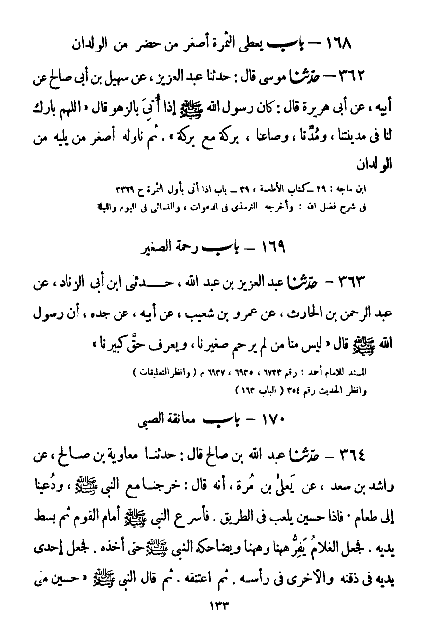 363 - حَدَّثَنَا عَبْدُ الْعَزِيزِ بْنُ عَبْدِ اللَّهِ، حَدَّثَنِي ابْنُ أَبِي الزِّنَادِ، عَنْ عَبْدِ الرَّحْمَنِ بْنِ الْحَارِثِ، عَنْ عَمْرِو بْنِ شُعَيْبٍ، عَنْ أَبِيهِ، عَنْ جَدِّهِ، أَنَّ رَسُولَ اللَّهِ صَلَّى اللهُ عَلَيْهِ وَسَلَّمَ قَالَ: «§لَيْسَ مِنَّا مَنْ لَمْ يَرْحَمْ صَغِيرَنَا، وَيَعْرِفْ حَقَّ كَبِيرِنَا» Kصحيح