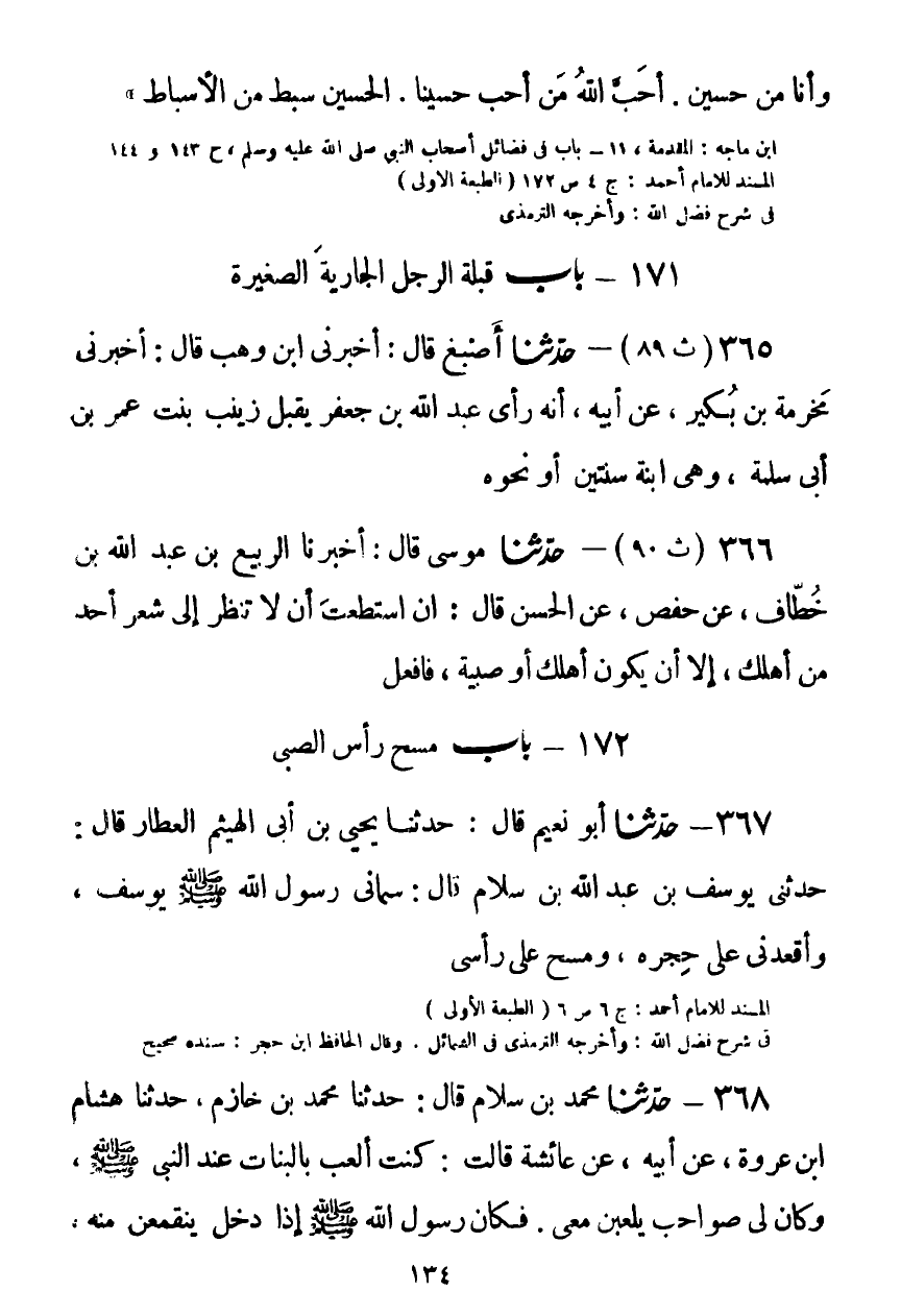 365 - حَدَّثَنَا أَصْبَغُ قَالَ: أَخْبَرَنِي ابْنُ وَهْبٍ قَالَ: أَخْبَرَنِي مَخْرَمَةُ بْنُ بُكَيْرٍ، عَنْ أَبِيهِ، أَنَّهُ رَأَى عَبْدَ اللَّهِ بْنَ جَعْفَرٍ §يُقَبِّلُ زَيْنَبَ بِنْتَ عُمَرَ بْنِ أَبِي سَلَمَةَ، وَهِيَ ابْنَةُ سَنَتَيْنِ أَوْ نَحْوَهُKصحيح