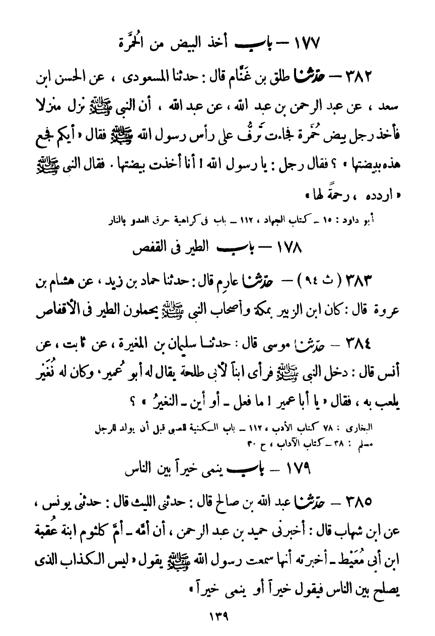 382 - حَدَّثَنَا طَلْقُ بْنُ غَنَّامٍ قَالَ: حَدَّثَنَا الْمَسْعُودِيُّ، عَنِ الْحَسَنِ بْنِ سَعْدٍ، عَنْ عَبْدِ الرَّحْمَنِ بْنِ عَبْدِ اللَّهِ، عَنْ عَبْدِ اللَّهِ، أَنَّ النَّبِيَّ صَلَّى اللهُ عَلَيْهِ وَسَلَّمَ نَزَلَ مَنْزِلًا فَأَخَذَ رَجُلٌ بَيْضَ حُمَّرَةٍ، فَجَاءَتْ تَرِفُّ عَلَى رَأْسِ رَسُولِ اللَّهِ صَلَّى اللهُ عَلَيْهِ وَسَلَّمَ فَقَالَ: «§أَيُّكُمْ فَجَعَ هَذِهِ بِبَيْضَتِهَا؟» فَقَالَ رَجُلٌ: يَا رَسُولَ اللَّهِ، أَنَا أَخَذْتُ بَيْضَتَهَا، فَقَالَ النَّبِيُّ صَلَّى اللهُ عَلَيْهِ وَسَلَّمَ: «ارْدُدْ، رَحْمَةً لَهَا» Kصحيح