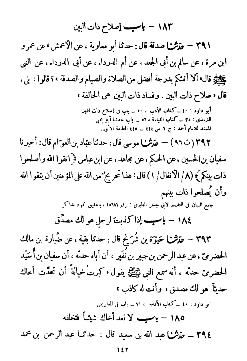 391 - حَدَّثَنَا صَدَقَةُ قَالَ: حَدَّثَنَا أَبُو مُعَاوِيَةَ، عَنِ الْأَعْمَشِ، عَنْ عَمْرِو بْنِ مُرَّةَ، عَنْ سَالِمِ بْنِ أَبِي الْجَعْدِ، عَنْ أُمِّ الدَّرْدَاءِ، عَنْ أَبِي الدَّرْدَاءِ، عَنِ النَّبِيِّ صَلَّى اللهُ عَلَيْهِ وَسَلَّمَ قَالَ: «أَلَا أُنَبِّئُكُمْ بِدَرَجَةٍ أَفْضَلَ مِنَ الصَّلَاةِ وَالصِّيَامِ وَالصَّدَقَةِ؟» قَالُوا: بَلَى، قَالَ: «§صَلَاحُ ذَاتِ الْبَيْنِ، وَفَسَادُ ذَاتِ الْبَيْنِ هِيَ الْحَالِقَةُ» Kصحيح