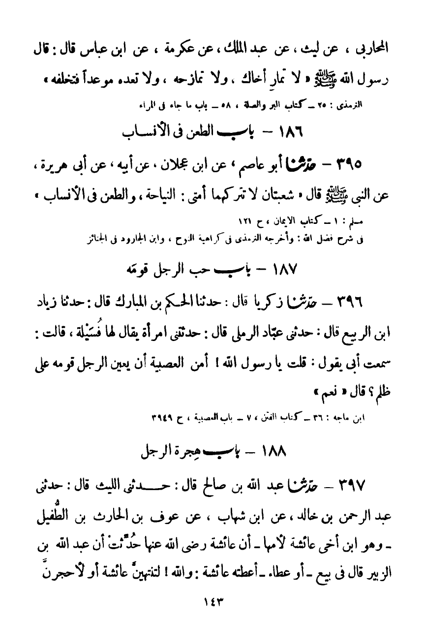 397 - حَدَّثَنَا عَبْدُ اللَّهِ بْنُ صَالِحٍ قَالَ: حَدَّثَنِي اللَّيْثُ قَالَ: حَدَّثَنِي عَبْدُ الرَّحْمَنِ بْنُ خَالِدٍ، عَنِ ابْنِ شِهَابٍ، عَنْ عَوْفِ بْنِ الْحَارِثِ بْنِ الطُّفَيْلِ، وَهُوَ ابْنُ أَخِي عَائِشَةَ لِأُمِّهَا، أَنَّ عَائِشَةَ رَضِيَ اللَّهُ عَنْهَا حُدِّثَتْ، أَنَّ عَبْدَ اللَّهِ بْنَ الزُّبَيْرِ قَالَ فِي بَيْعٍ - أَوْ عَطَاءٍ - أَعْطَتْهُ عَائِشَةُ: وَاللَّهِ لَتَنْتَهِيَنَّ عَائِشَةُ أَوْ لَأَحْجُرَنَّ عَلَيْهَا، فَقَالَتْ: أَهُوَ قَالَ هَذَا؟ قَالُوا: نَعَمْ، قَالَتْ عَائِشَةُ: فَهُوَ لِلَّهِ نَذْرٌ أَنْ لَا أُكَلِّمَ ابْنَ الزُّبَيْرِ كَلِمَةً أَبَدًا، فَاسْتَشْفَعَ ابْنُ الزُّبَيْرِ بِالْمُهَاجِرِينَ حِينَ طَالَتْ هِجْرَتُهَا إِيَّاهُ، فَقَالَتْ: وَاللَّهِ، لَا أُشَفِّعُ فِيهِ أَحَدًا أَبَدًا، وَلَا أُحَنِّثُ نَذْرِي الَّذِي نَذَرْتُ أَبَدًا. فَلَمَّا طَالَ عَلَى ابْنِ الزُّبَيْرِ كَلَّمَ الْمِسْوَرَ بْنَ مَخْرَمَةَ وَعَبْدَ الرَّحْمَنِ بْنَ الْأَسْوَدِ بْنِ يَغُوثَ، وَهُمَا مِنْ بَنِي زُهْرَةَ، فَقَالَ لَهُمَا: أَنْشُدُكُمَا بِاللَّهِ إِلَّا أَدْخَلْتُمَانِي عَلَى عَائِشَةَ، فَإِنَّهَا لَا يَحِلُّ لَهَا أَنْ تَنْذِرَ قَطِيعَتِي، فَأَقْبَلَ بِهِ الْمِسْوَرُ وَعَبْدُ الرَّحْمَنِ مُشْتَمِلَيْنِ عَلَيْهِ بِأَرْدِيَتِهِمَا، حَتَّى اسْتَأْذَنَا عَلَى عَائِشَةَ فَقَالَا: السَّلَامُ عَلَيْكِ وَرَحْمَةُ اللَّهِ وَبَرَكَاتُهُ، أَنَدْخُلُ؟ فَقَالَتْ عَائِشَةُ: ادْخُلُوا، قَالَا: كُلُّنَا يَا أُمَّ الْمُؤْمِنِينَ؟ قَالَتْ: نَعَمْ، ادْخُلُوا كُلُّكُمْ. وَلَا تَعْلَمُ عَائِشَةُ أَنَّ مَعَهُمَا ابْنَ الزُّبَيْرِ، فَلَمَّا دَخَلُوا دَخَلَ ابْنُ الزُّبَيْرِ فِي الْحِجَابِ، وَاعْتَنَقَ عَائِشَةَ وَطَفِقَ يُنَاشِدُهَا يَبْكِي، وَطَفِقَ الْمِسْوَرُ وَعَبْدُ الرَّحْمَنِ يُنَاشِدَانِ عَائِشَةَ إِلَّا كَلَّمَتْهُ وَقَبِلَتْ مِنْهُ، وَيَقُولَانِ: قَدْ عَلِمْتِ أَنَّ رَسُولَ اللَّهِ صَلَّى اللهُ عَلَيْهِ وَسَلَّمَ نَهَى عَمَّا قَدْ عَلِمْتِ مِنَ الْهِجْرَةِ، وَأَنَّهُ §لَا يَحِلُّ لِلرَّجُلِ أَنْ يَهْجُرَ أَخَاهُ فَوْقَ ثَلَاثِ لَيَالٍ. قَالَ: فَلَمَّا أَكْثَرُوا التَّذْكِيرَ وَالتَّحْرِيجَ طَفِقَتْ تُذَكِّرُهُمْ وَتَبْكِي وَتَقُولُ: إِنِّي قَدْ نَذَرْتُ وَالنَّذْرُ شَدِيدٌ، فَلَمْ يَزَالُوا بِهَا حَتَّى كَلَّمَتِ ابْنَ الزُّبَيْرِ، ثُمَّ أَعْتَقَتْ بِنَذْرِهَا أَرْبَعِينَ رَقَبَةً، ثُمَّ كَانَتْ تَذْكُرُ بَعْدَ مَا أَعْتَقَتْ أَرْبَعِينَ رَقَبَةً فَتَبْكِي حَتَّى تَبُلَّ دُمُوعُهَا خِمَارَهَاKصحيح
