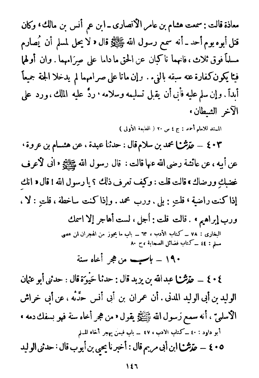 404 - حَدَّثَنَا عَبْدُ اللَّهِ بْنُ يَزِيدَ قَالَ: حَدَّثَنَا حَيْوَةُ قَالَ: حَدَّثَنِي أَبُو عُثْمَانَ الْوَلِيدُ بْنُ أَبِي الْوَلِيدِ الْمَدَنِيُّ، أَنَّ عِمْرَانَ بْنَ أَبِي أَنَسٍ حَدَّثَهُ، عَنْ أَبِي خِرَاشٍ السُّلَمِيِّ، أَنَّهُ سَمِعَ رَسُولَ اللَّهِ صَلَّى اللهُ عَلَيْهِ وَسَلَّمَ يَقُولُ: «§مَنْ هَجَرَ أَخَاهُ سَنَةً، فَهُوَ كَسَفْكِ دَمِهِ» Kصحيح